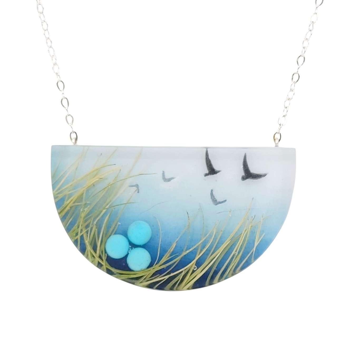 Necklace - Painted Nesting Birds with Green Grass by Fernworks