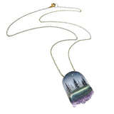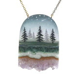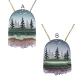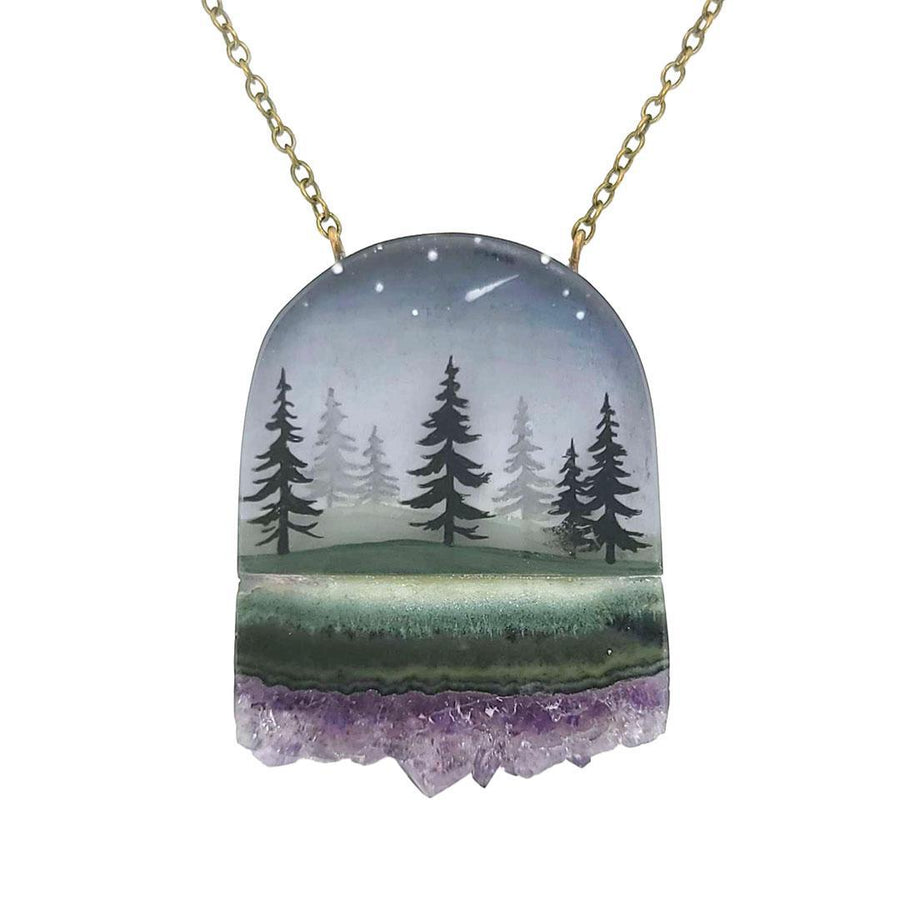 This stunning necklace features a forest of pines silhouetted against a dome-shaped starry night sky, accented by a slab of real amethyst or jasper.