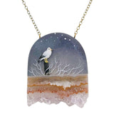 This stunning necklace features a seagull standing on a post against a starry sky, accented by a slab of real amethyst or jasper.