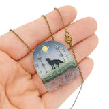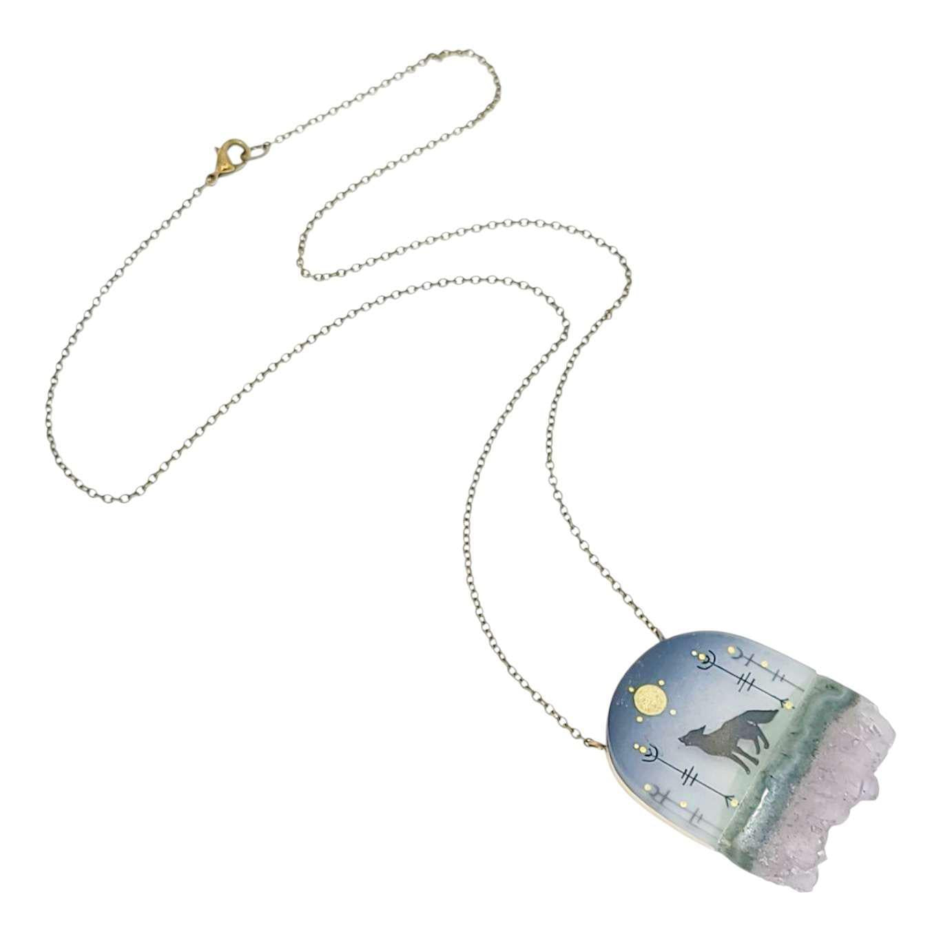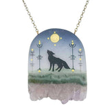 This stunning necklace features a howling wolf silhouetted against a night sky with a golden moon and abstract decorations, accented by a slab of real amethyst or jasper.