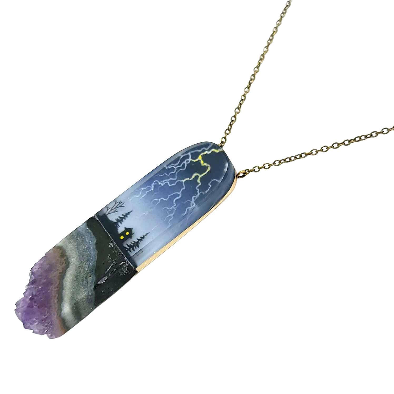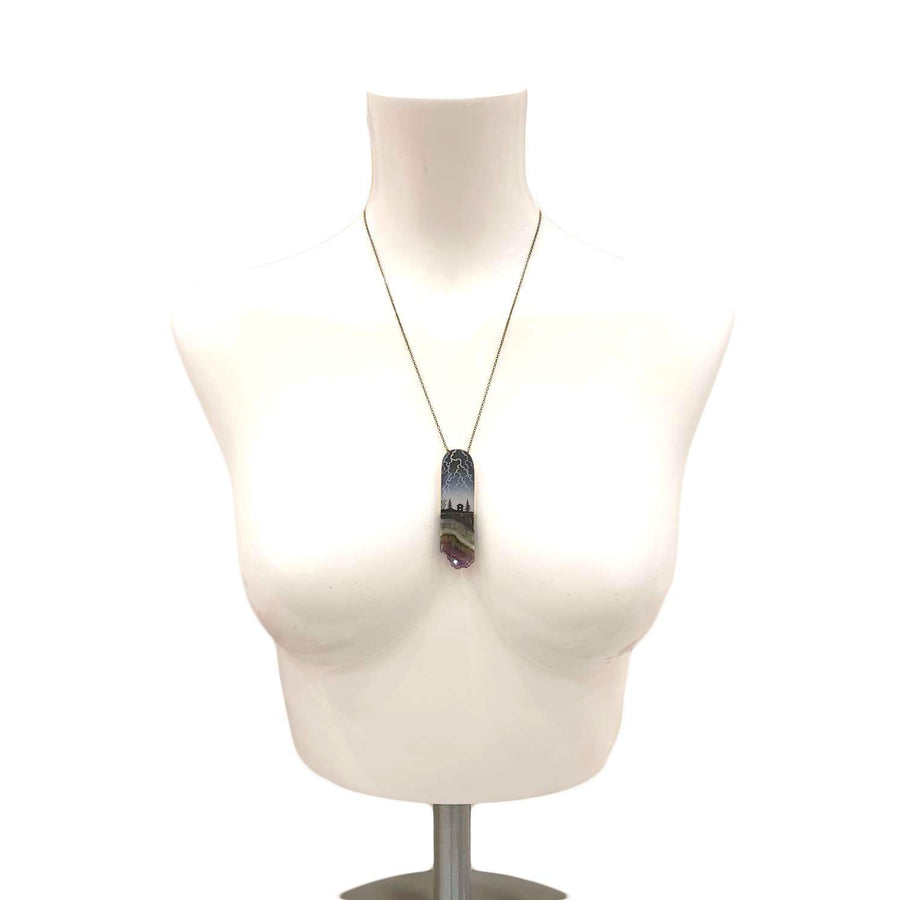 - Layered resin, acrylic paint, wood, stone, and gunmetal silver chain.