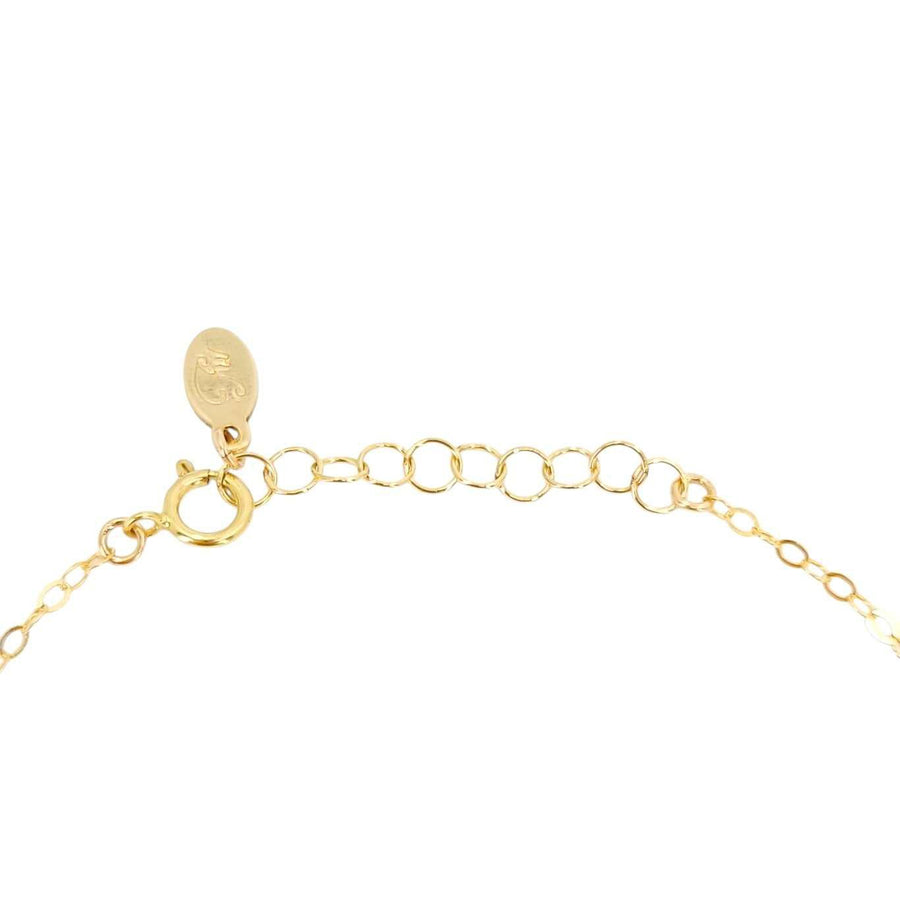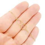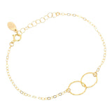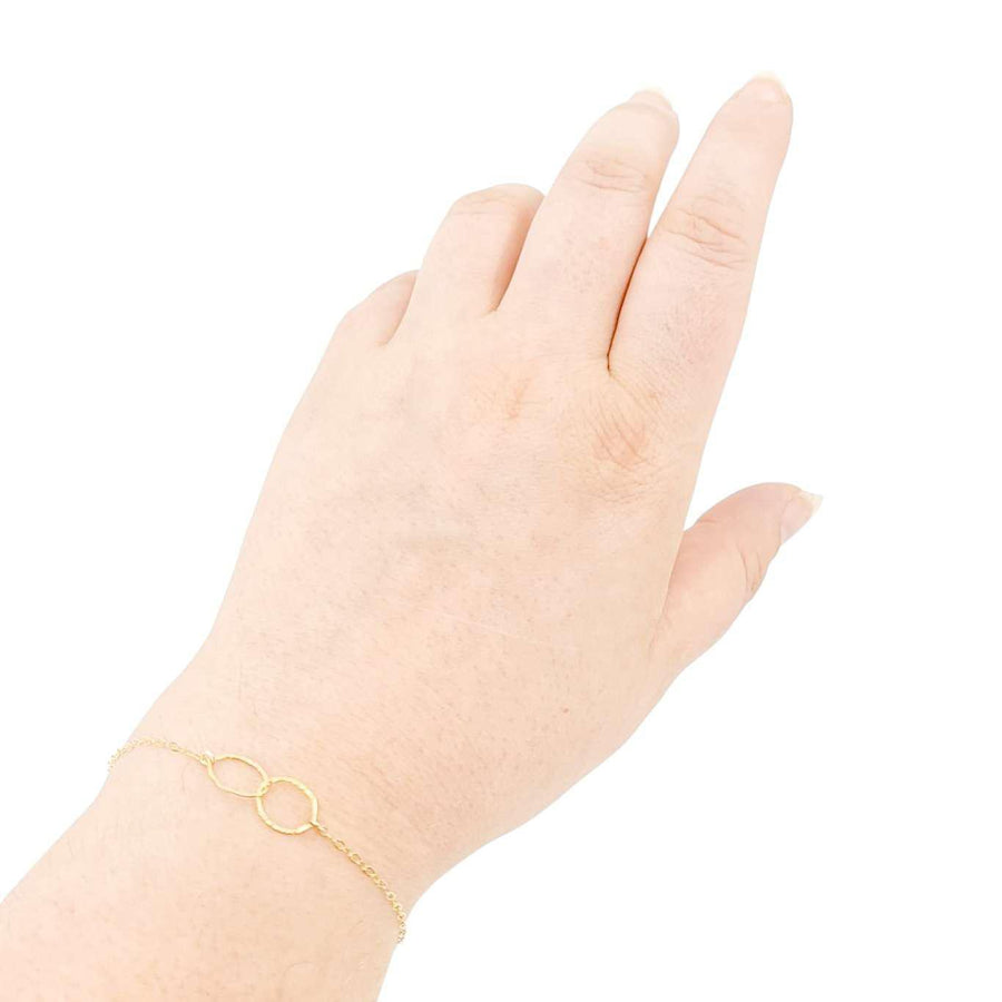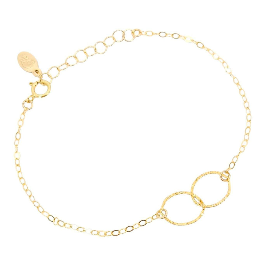 This delicate bracelet features two linked hand-textured circles on a 7-inch 14k yellow gold fill chain.