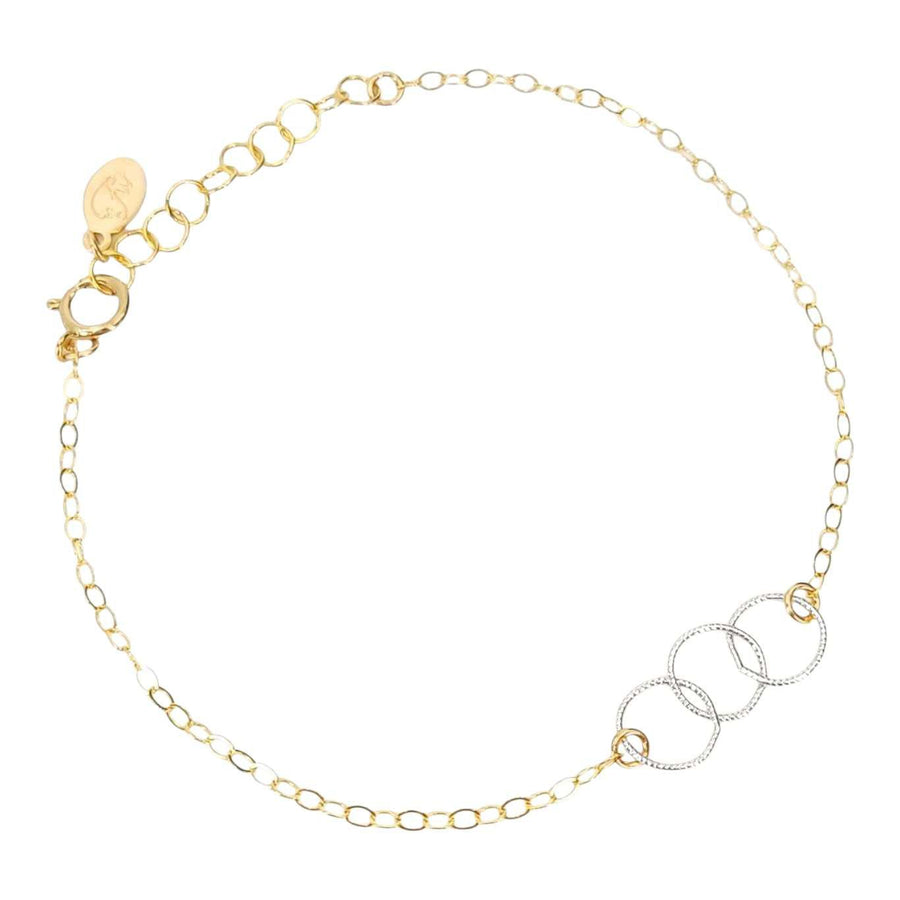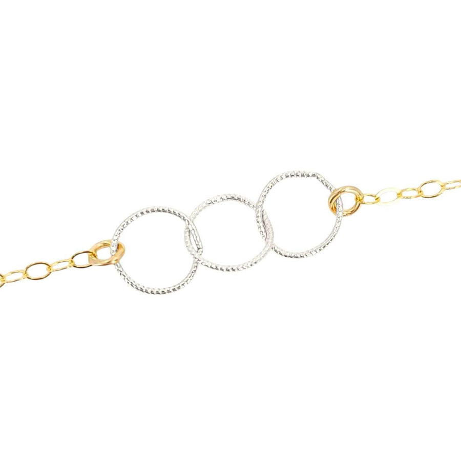 This delicate bracelet features three interlocked textured circles of sterling silver on a 7-inch 14k yellow gold fill chain.