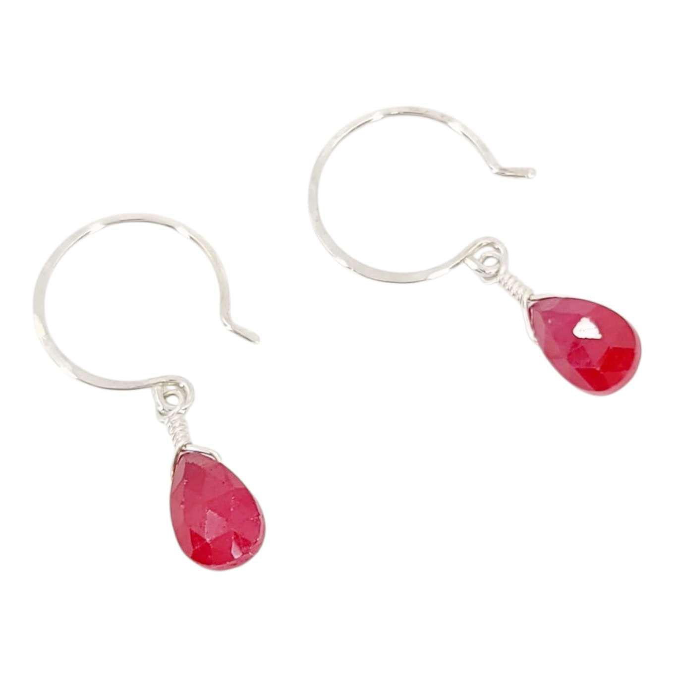 These sweet little earrings feature faceted teardrops of genuine ruby suspended on circular sterling silver ear wires.