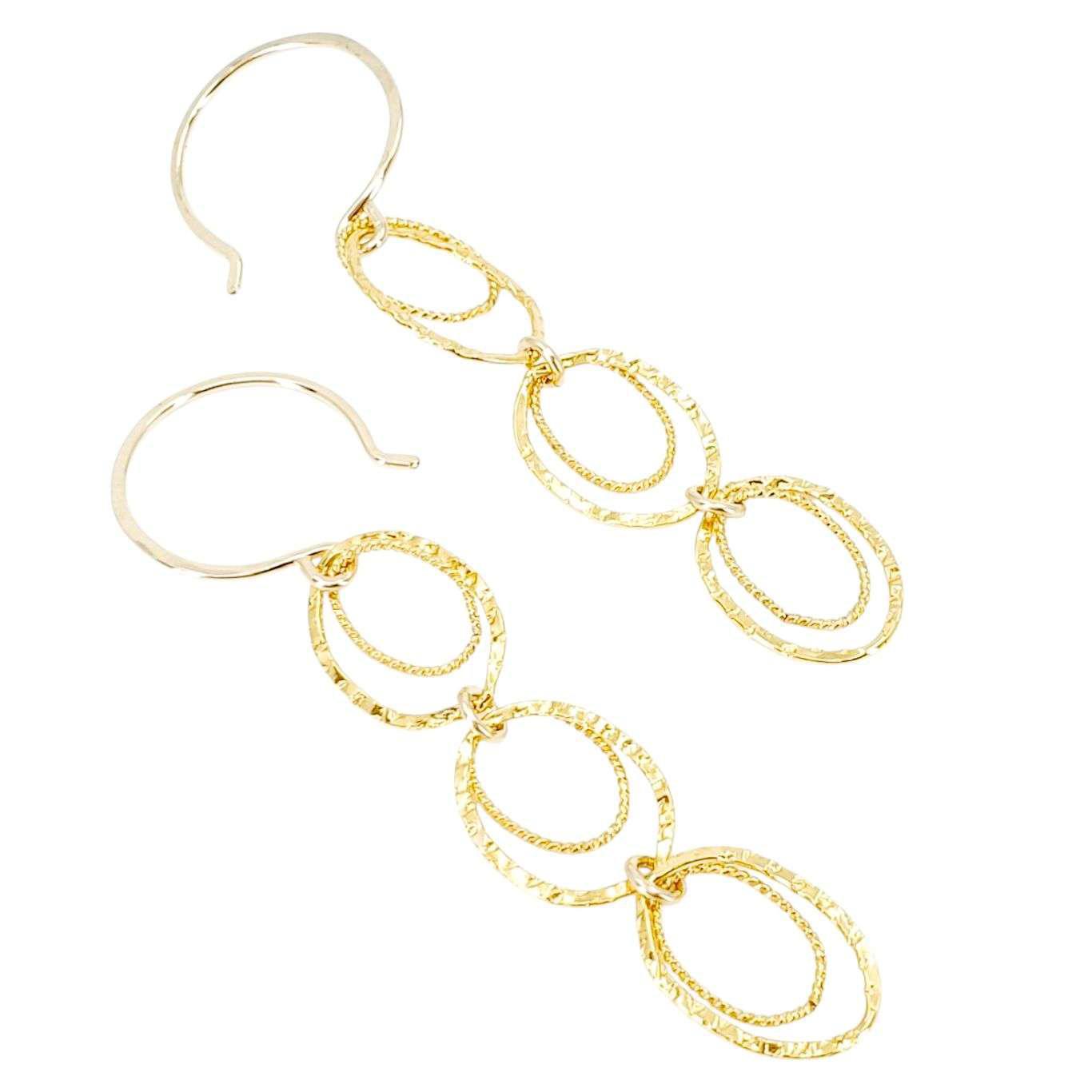 Six interlocking rings dangle elegantly from "lure" style ear wires for a dynamic and lively look. The outer rings feature a hand-hammered finish while the inner rings have a rope-like texture, for that perfect mix of style and sparkle. Great for parties, events, or even everyday wear!
