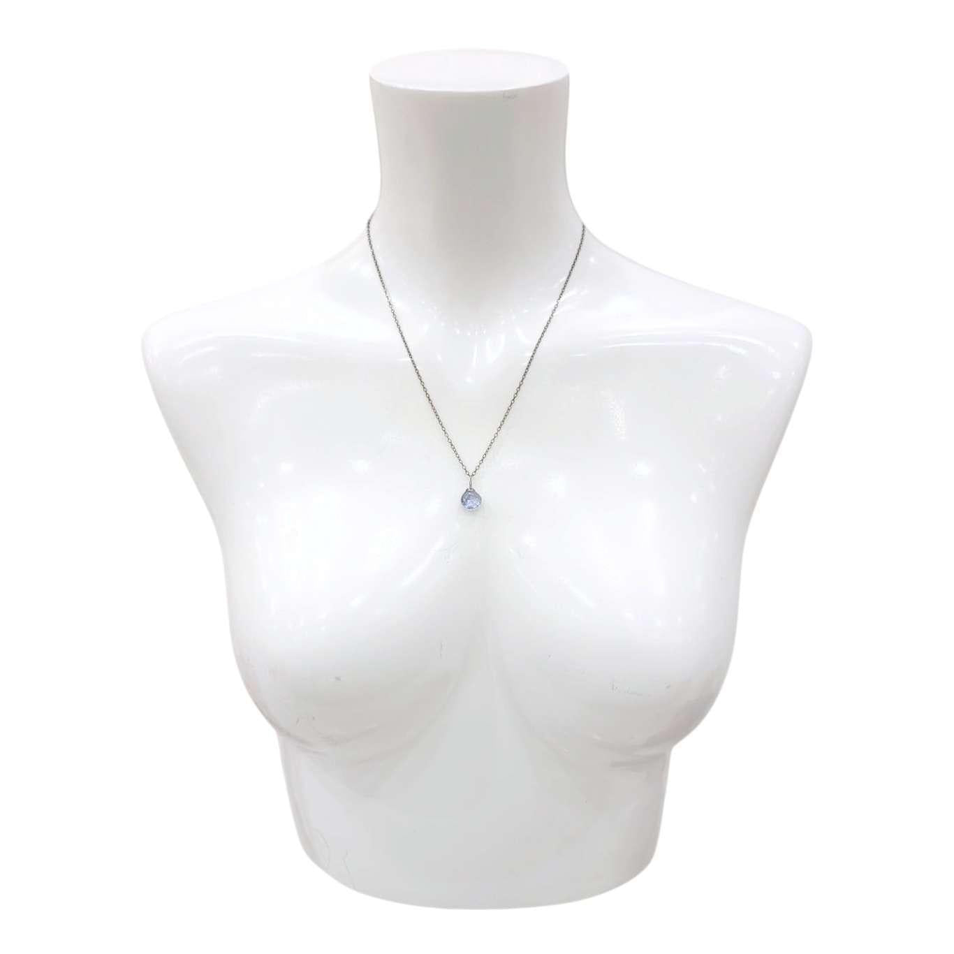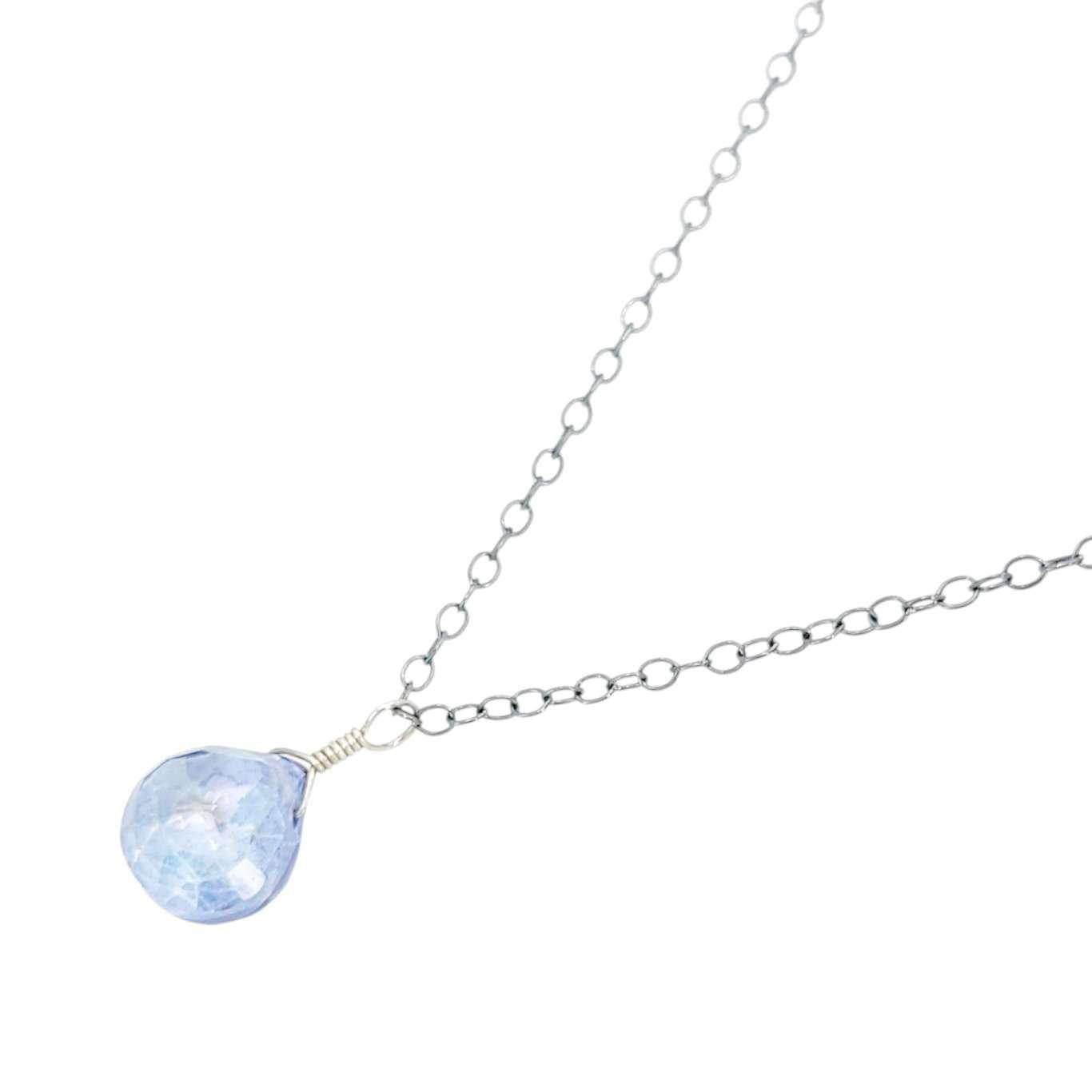 A faceted teardrop of soft blue mystic quartz rests on an 18-inch oxidized sterling silver chain.