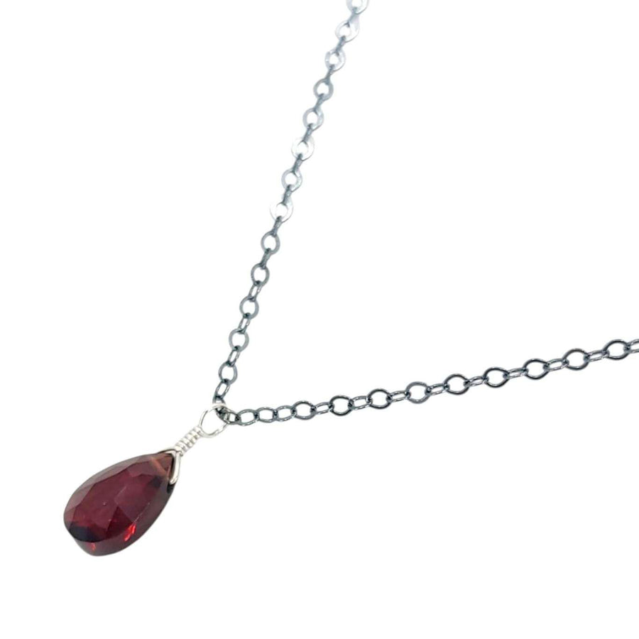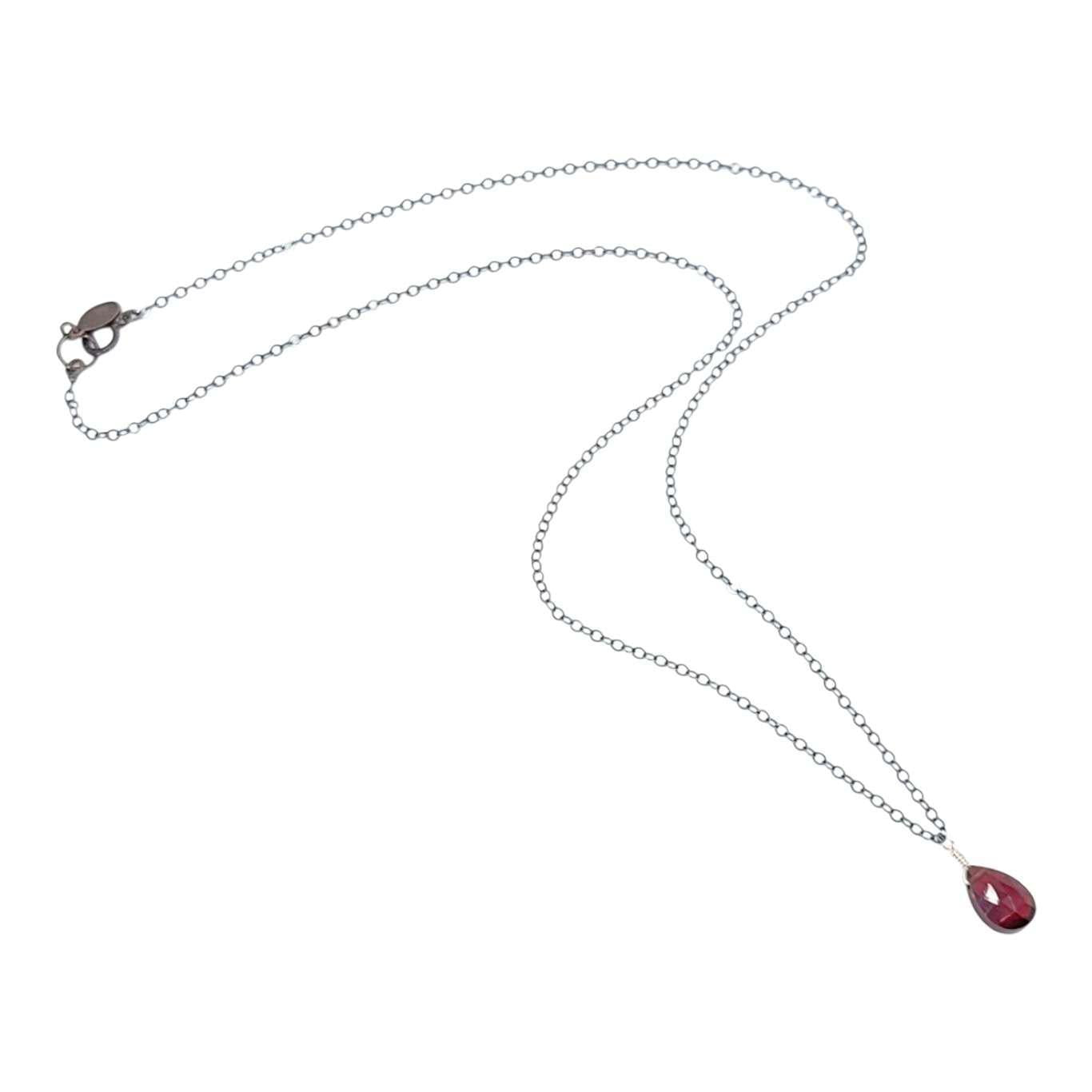 A faceted teardrop of deep crimson garnet rests on an 18-inch oxidized sterling silver chain.