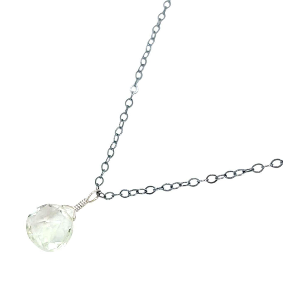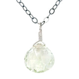 A faceted teardrop of clear green prasiolite (aka green amethyst) rests on an 18-inch oxidized sterling silver chain.