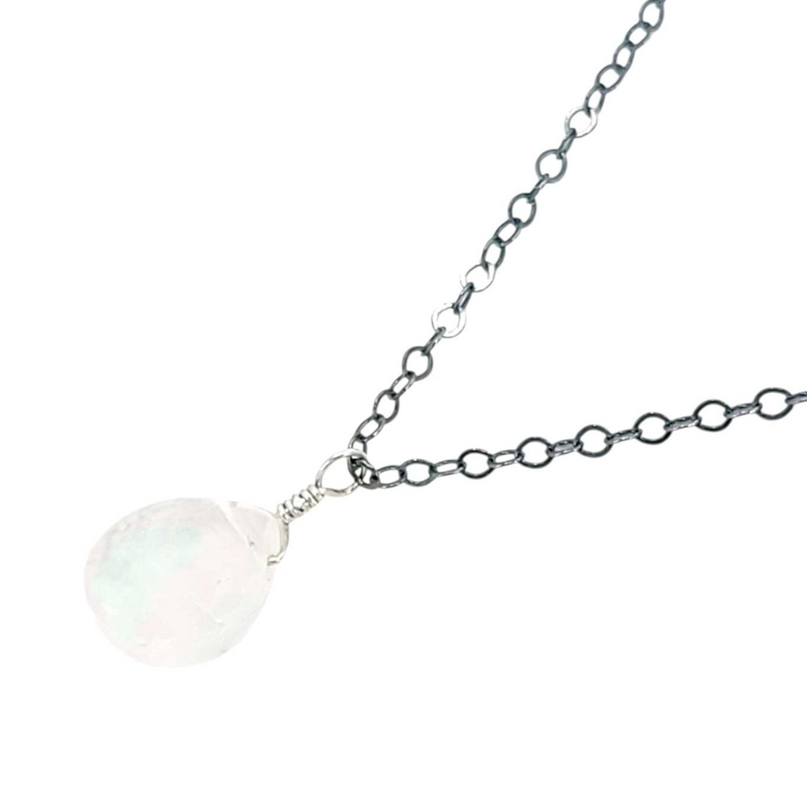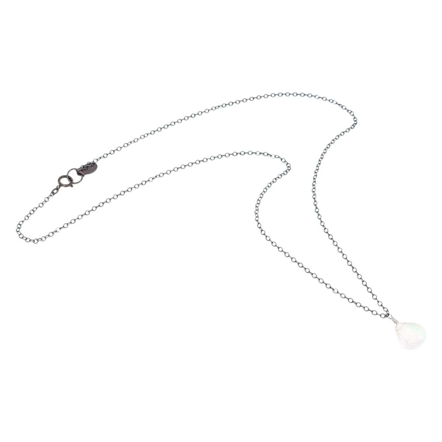 A faceted teardrop of translucent rainbow moonstone, with its characteristic multicolored flash, rests on an 18-inch oxidized sterling silver chain.