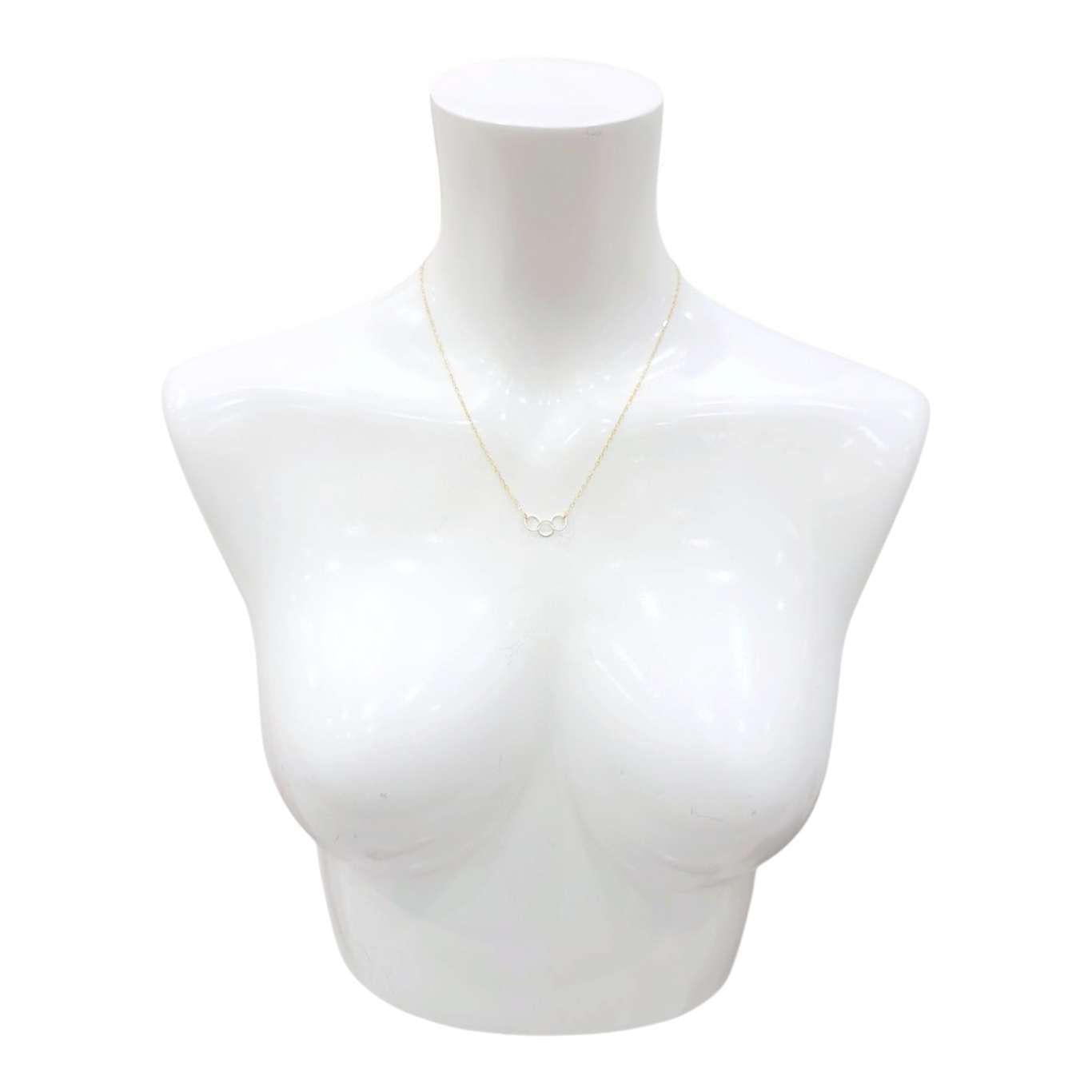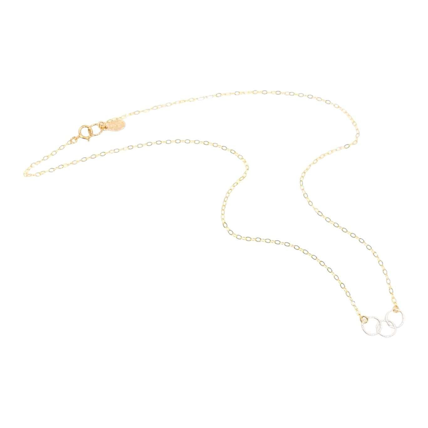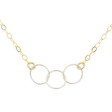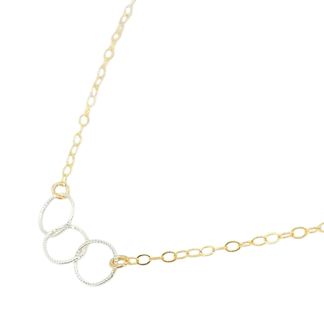 Three delicate rope-textured circles of sterling silver interlock on a 17-inch yellow gold fill chain.