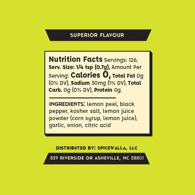 Lemon peel, black pepper, kosher salt, lemon juice powder (corn syrup, lemon juice), garlic, onion, citric acid
