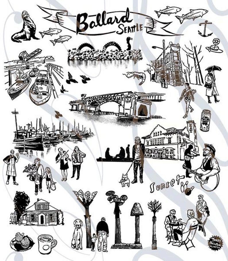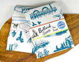 Seattle's beloved Ballard neighborhood landmarks are featured on this tea towel including Edith Macefield's House, Hatties Hat, Sunset Bowl, and Farmers Market buskers.