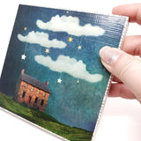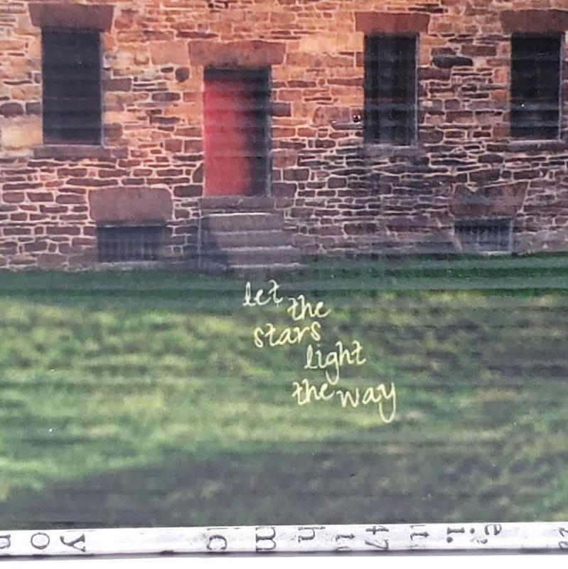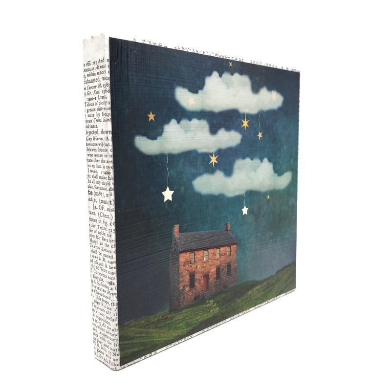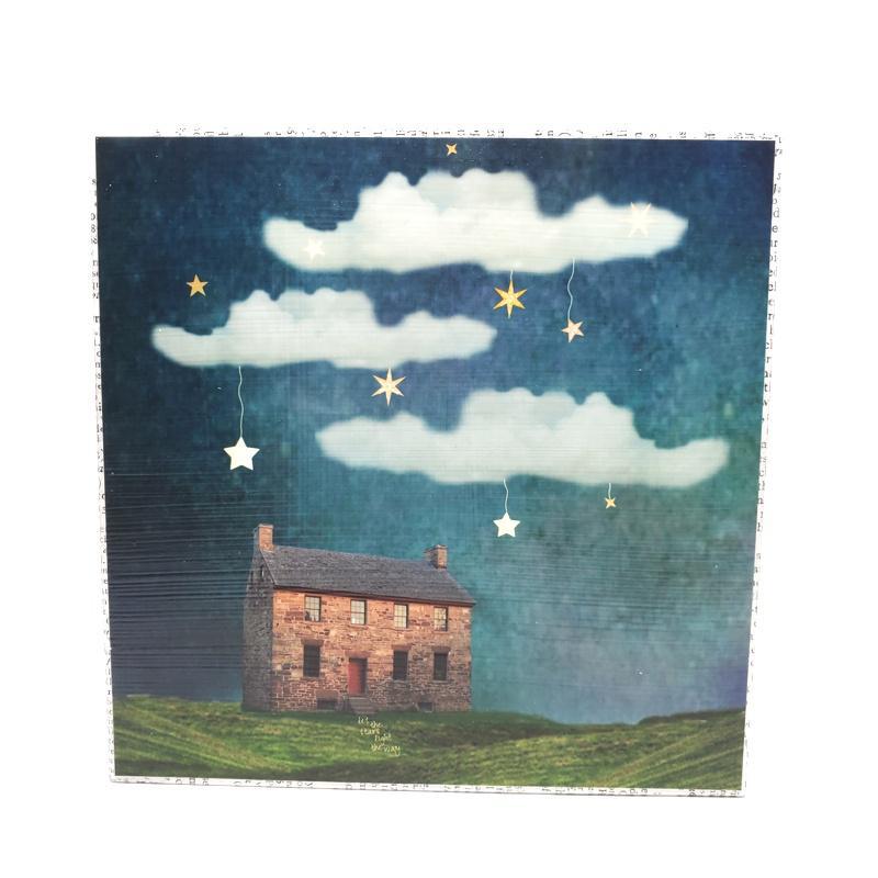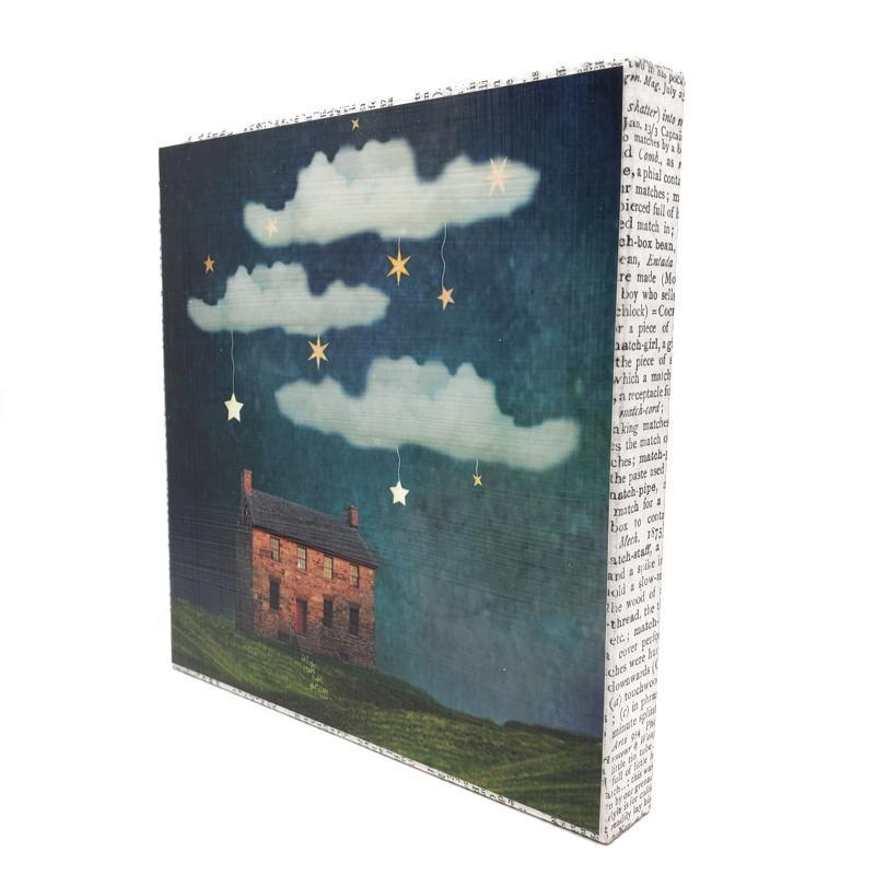 An old brick house with a red door sits on a verdant landscape beneath a trio of clouds in the night sky. Stars dangle from the clouds, causing the sky to glow and illuminating the house. Tiny handwritten words, almost imperceptibly small, tumble from the house's front steps, reading, "Let the stars light the way."