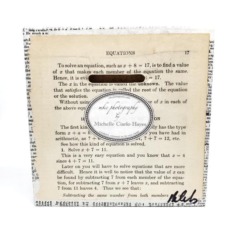 The block edges and backside are covered with vintage book pages, and the block is sealed with multiple layers of non-toxic matte varnish and signed on the reverse. It has a keyhole opening in the back for ease of hanging.