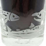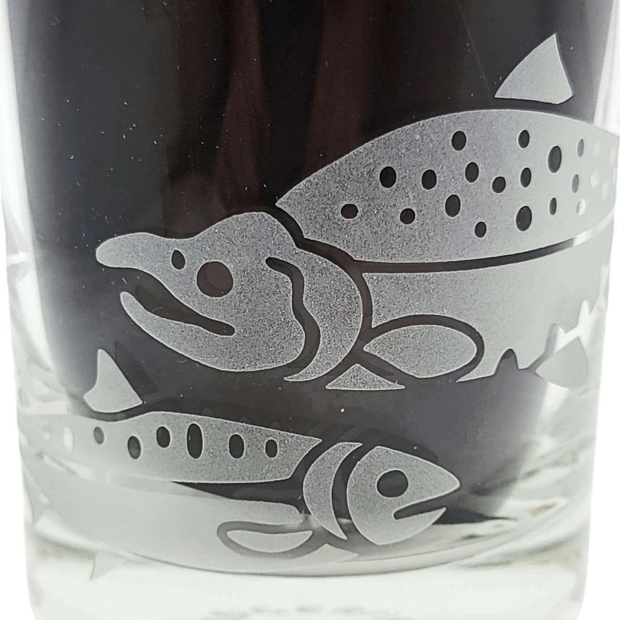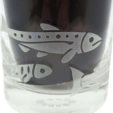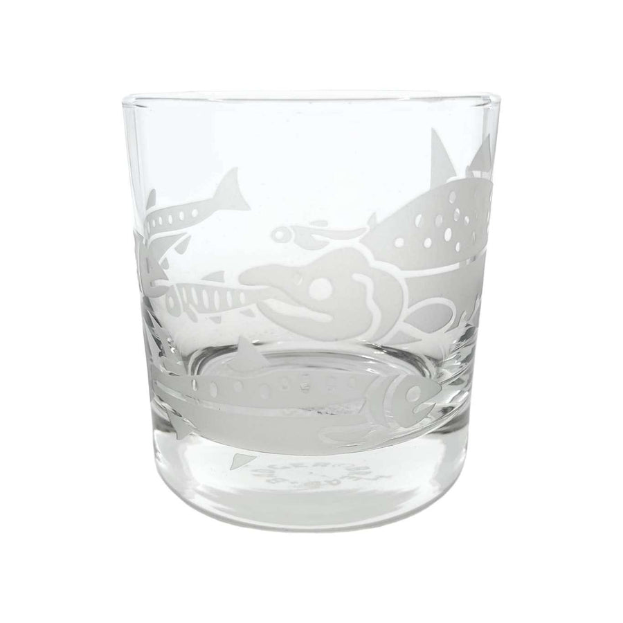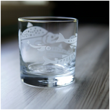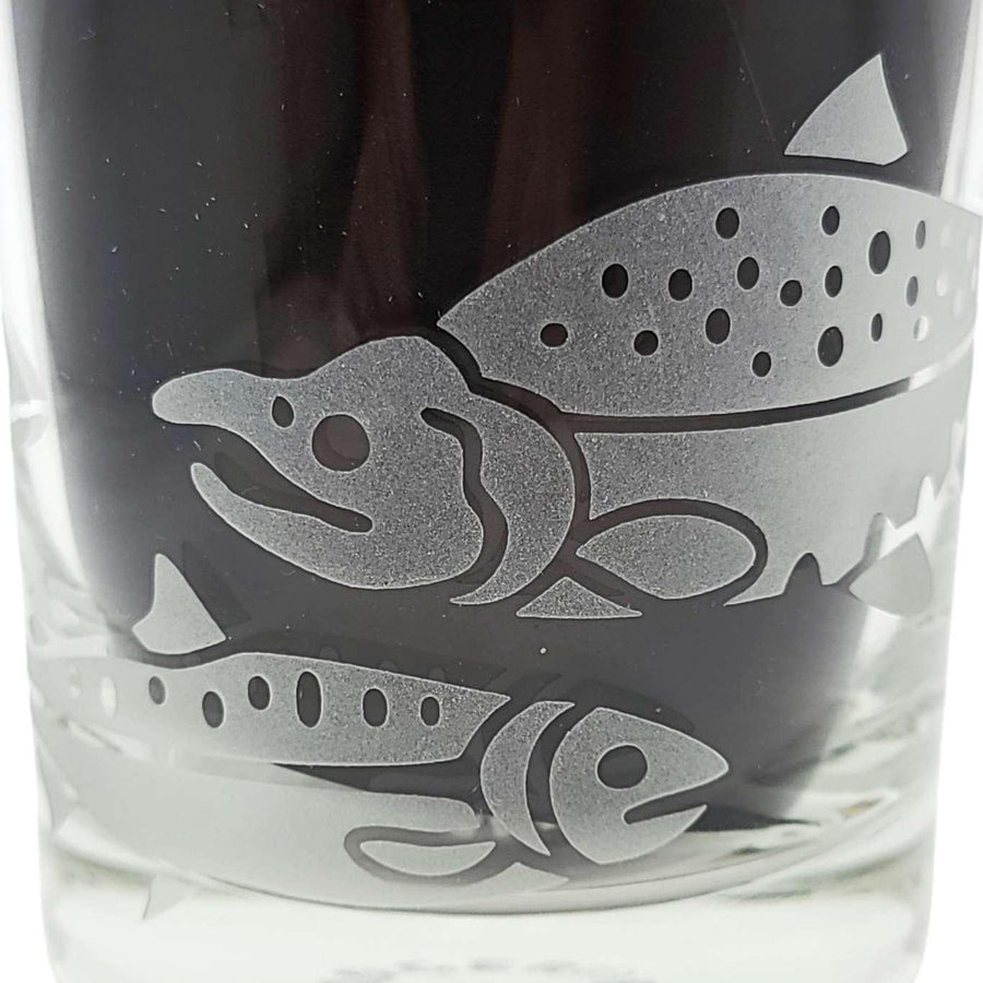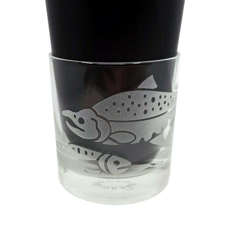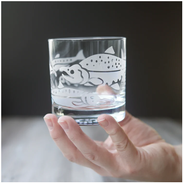 Treat yourself to these salmon-etched lowball glasses - it's the perfect way to add a touch of class and sass to your favorite drink (whether it be whiskey, wine, or just plain H2O). Perfect for folks who like to fish, especially dads and grandpas. The wraparound design shows salmon in different stages of development, with a full-grown sockeye salmon swimming back upstream to spawn.