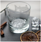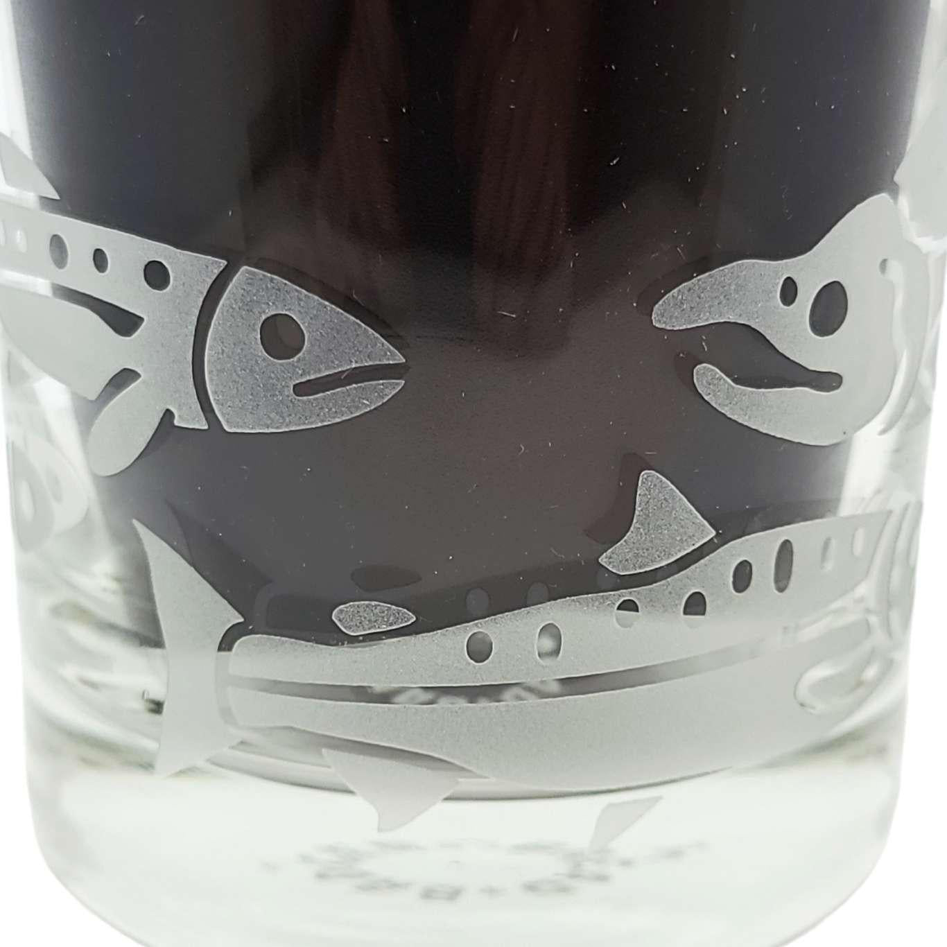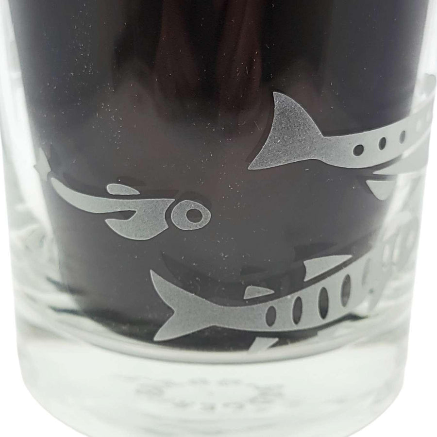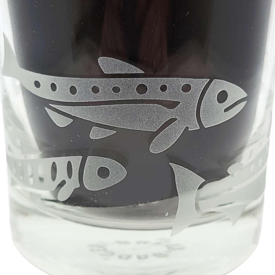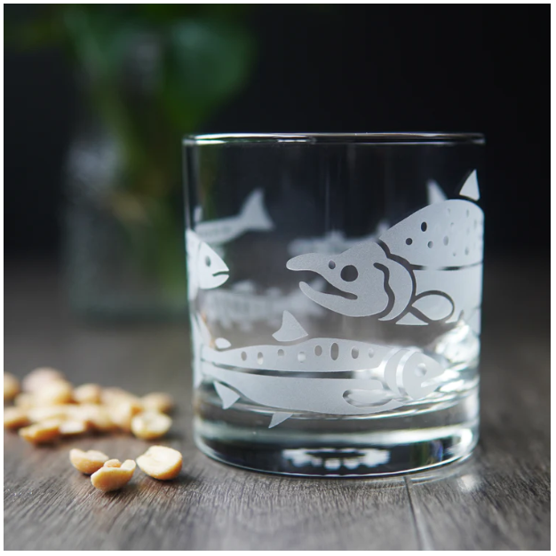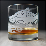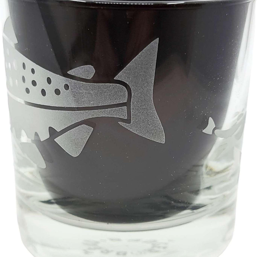 Treat yourself to these salmon-etched lowball glasses - it's the perfect way to add a touch of class and sass to your favorite drink (whether it be whiskey, wine, or just plain H2O). Perfect for folks who like to fish, especially dads and grandpas. The wraparound design shows salmon in different stages of development, with a full-grown sockeye salmon swimming back upstream to spawn.