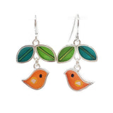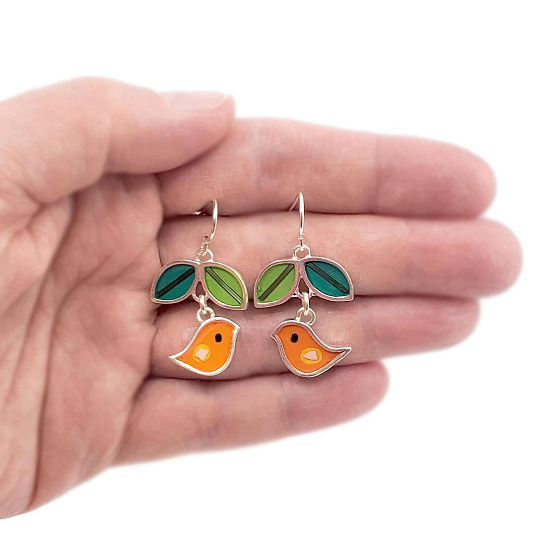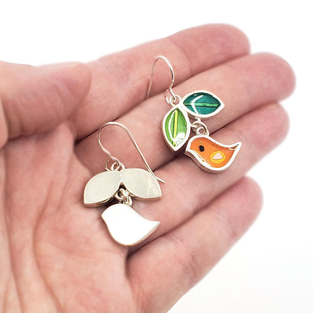 • Sweet little earrings featuring colorful birds under mismatched green leaves