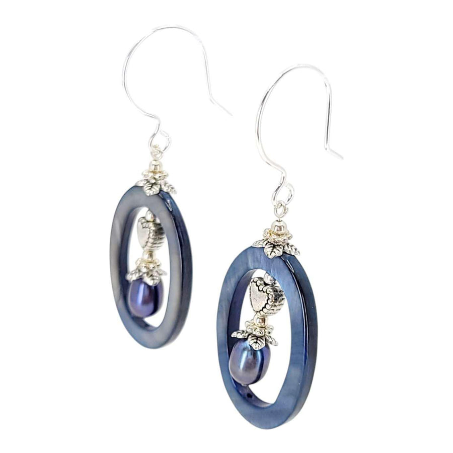 Earrings - Oval Shell Frame Pearl Heart Drops (Iridescent Blue, Silver Fill) by Tiny Aloha