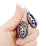 TAE270 $58 - Iridescent Blue Oval Shell Frame Pearl Heart Drop Silver Fill Earrings