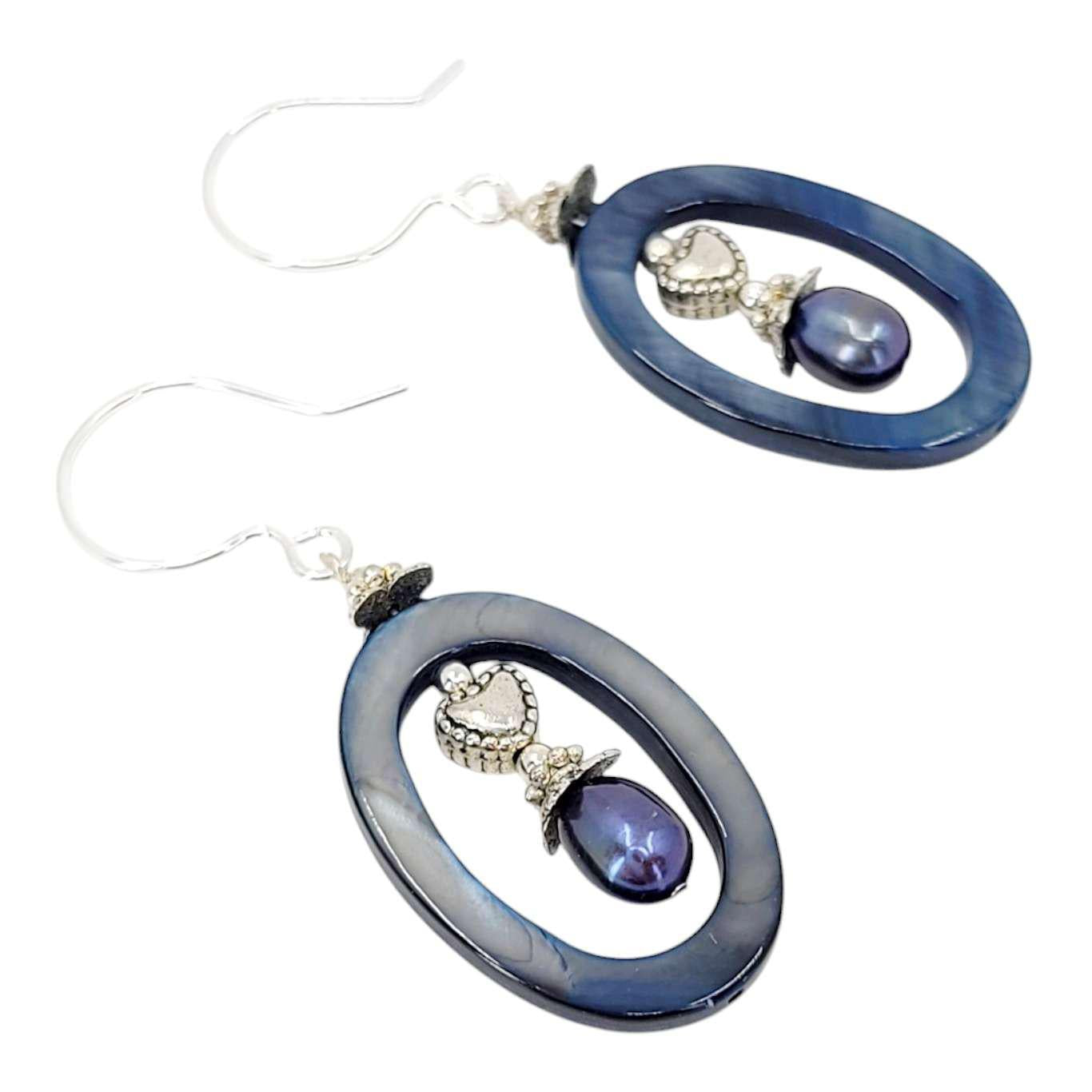 Ovals made of shimmering blue shell frame peacock freshwater pearls with small silver hearts and hang from silver fill ear wires.