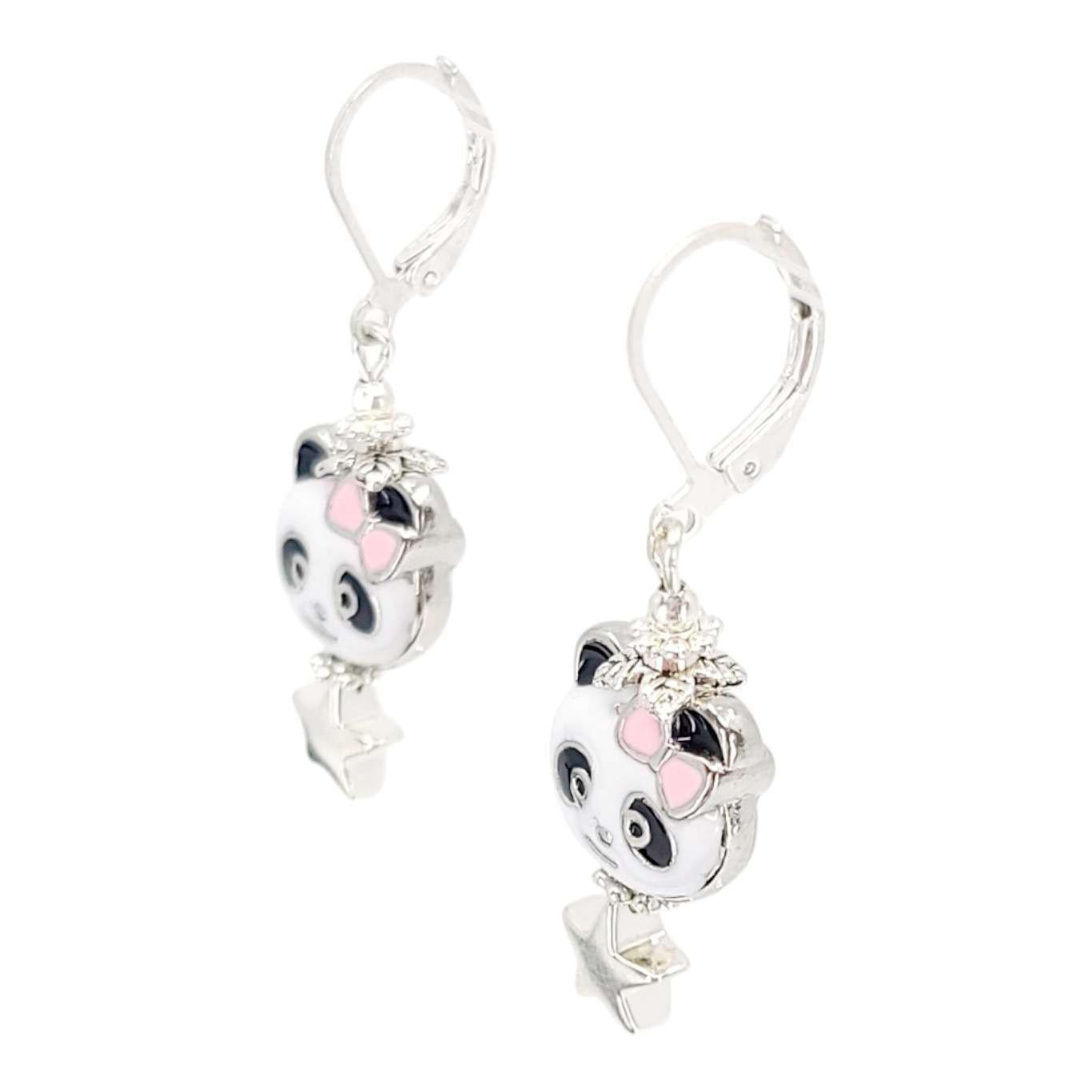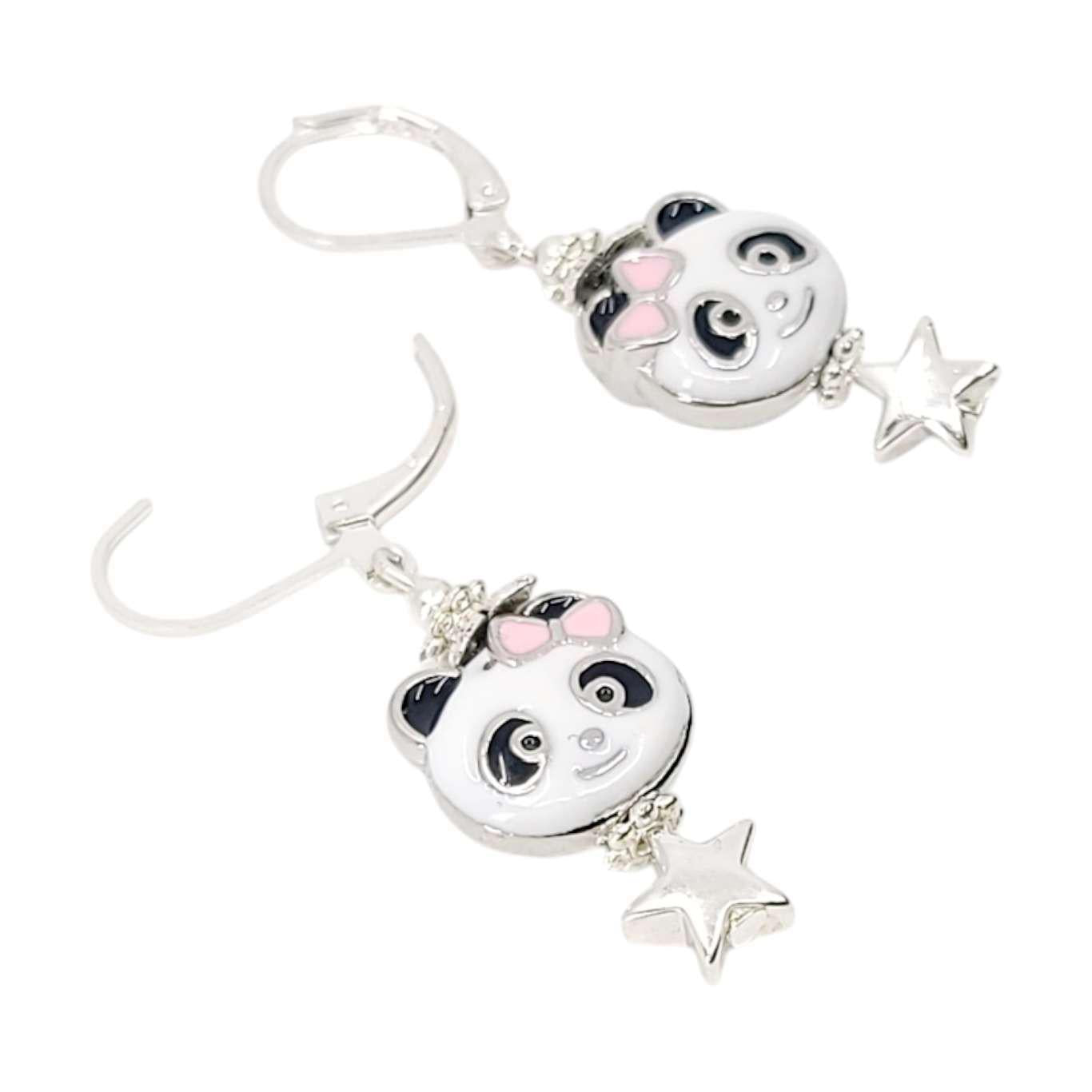 Adorable black and white panda faces with pink bows over silver stars hang from leverback ear wires that stay secure all day!