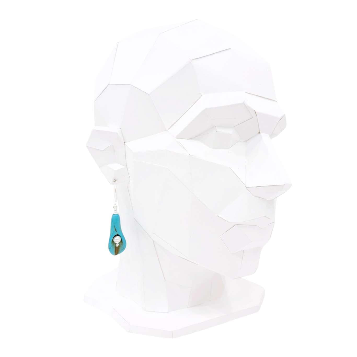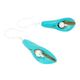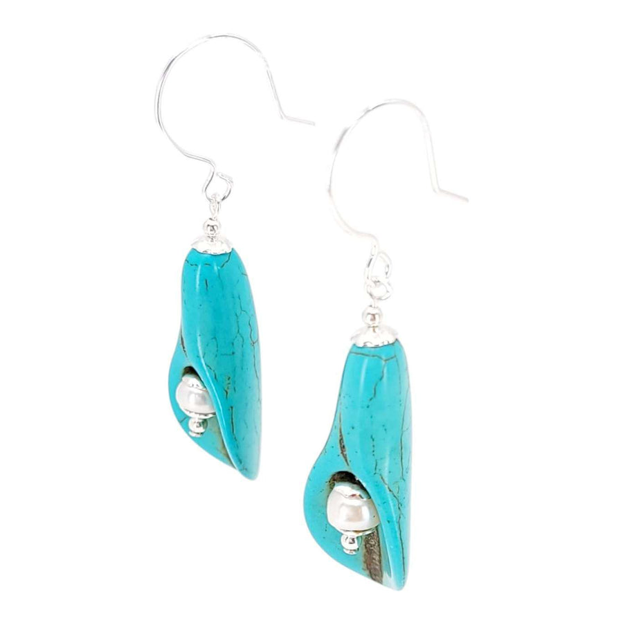Peace lily inspired turquoise dyed howlite pieces are set with a dainty freshwater pearl and hung on silver fill ear hooks.