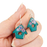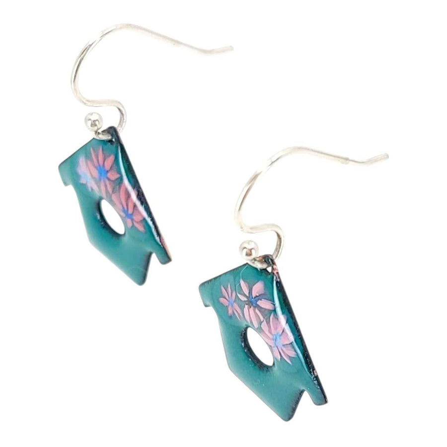 Earrings - Small House (Cadet Blue Pink Flowers) by Magpie Mouse Studios