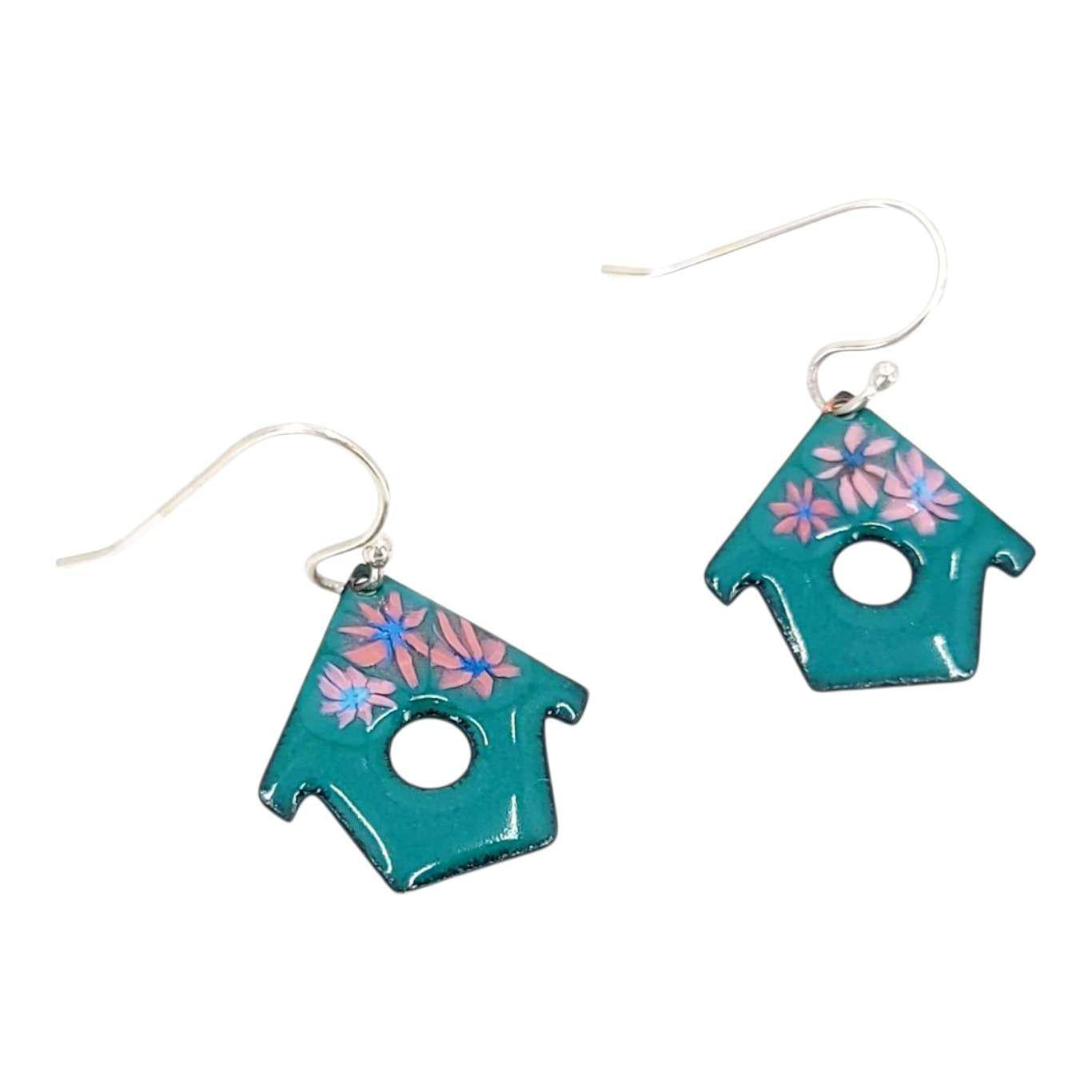Hand-formed copper birdhouse shapes covered in cadet blue glass enamel with three millefiori-style pink flowers. Even the backs are finished in a gorgeous speckled green color!