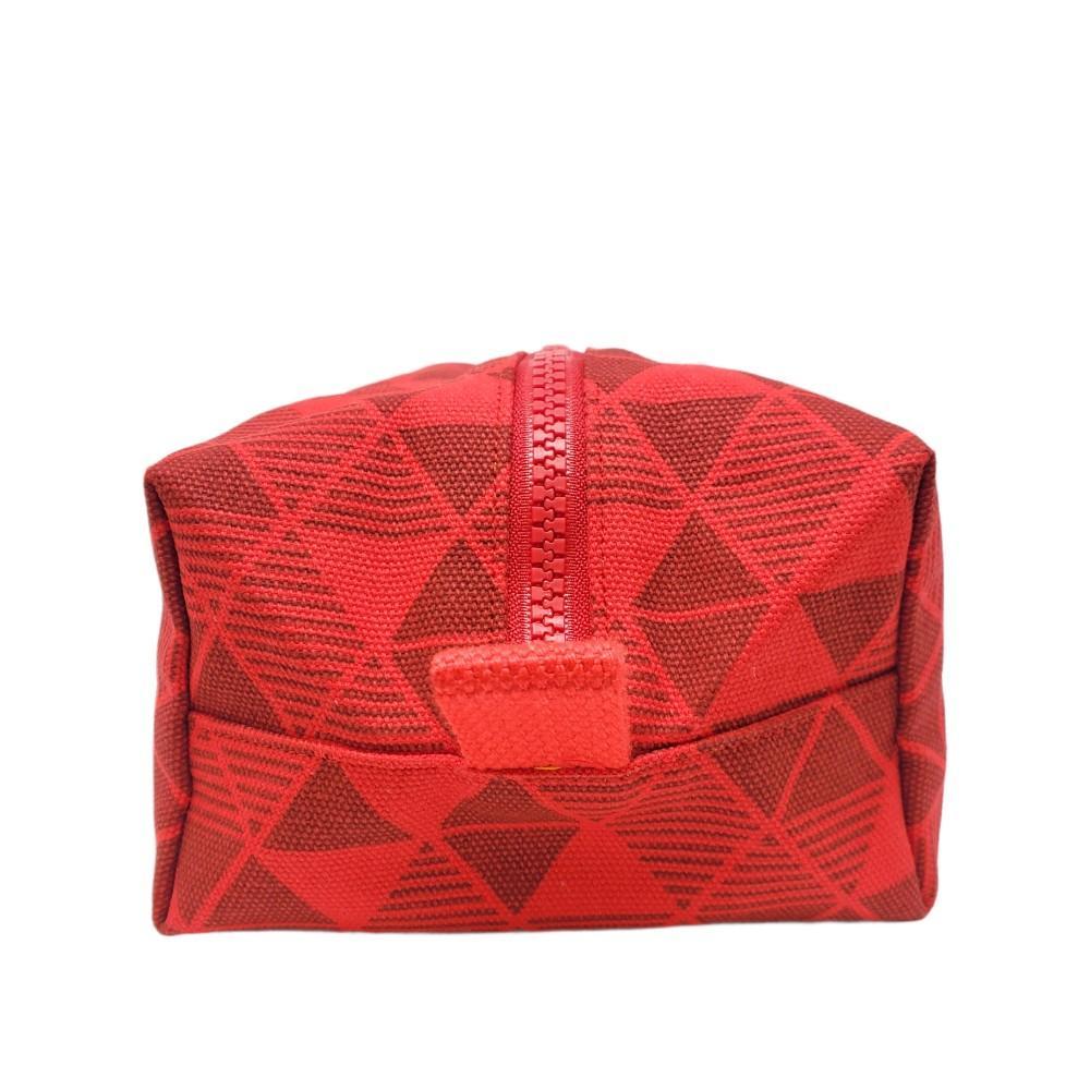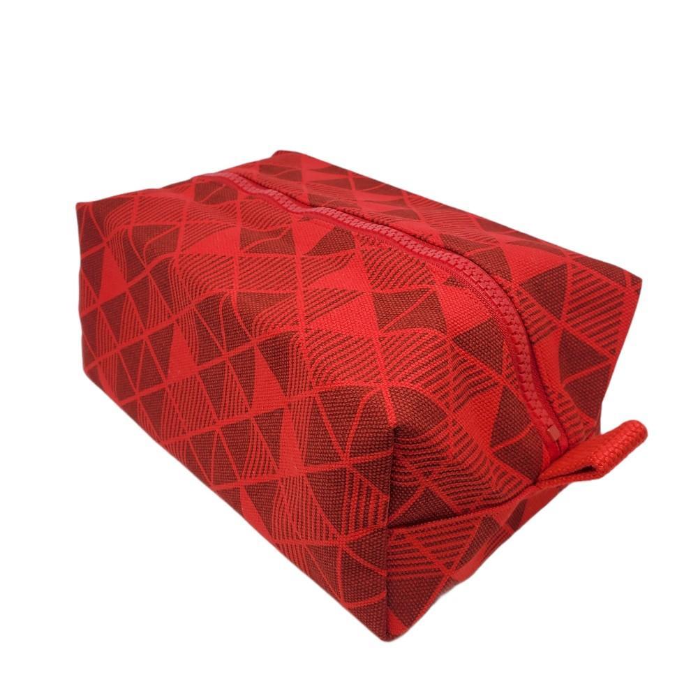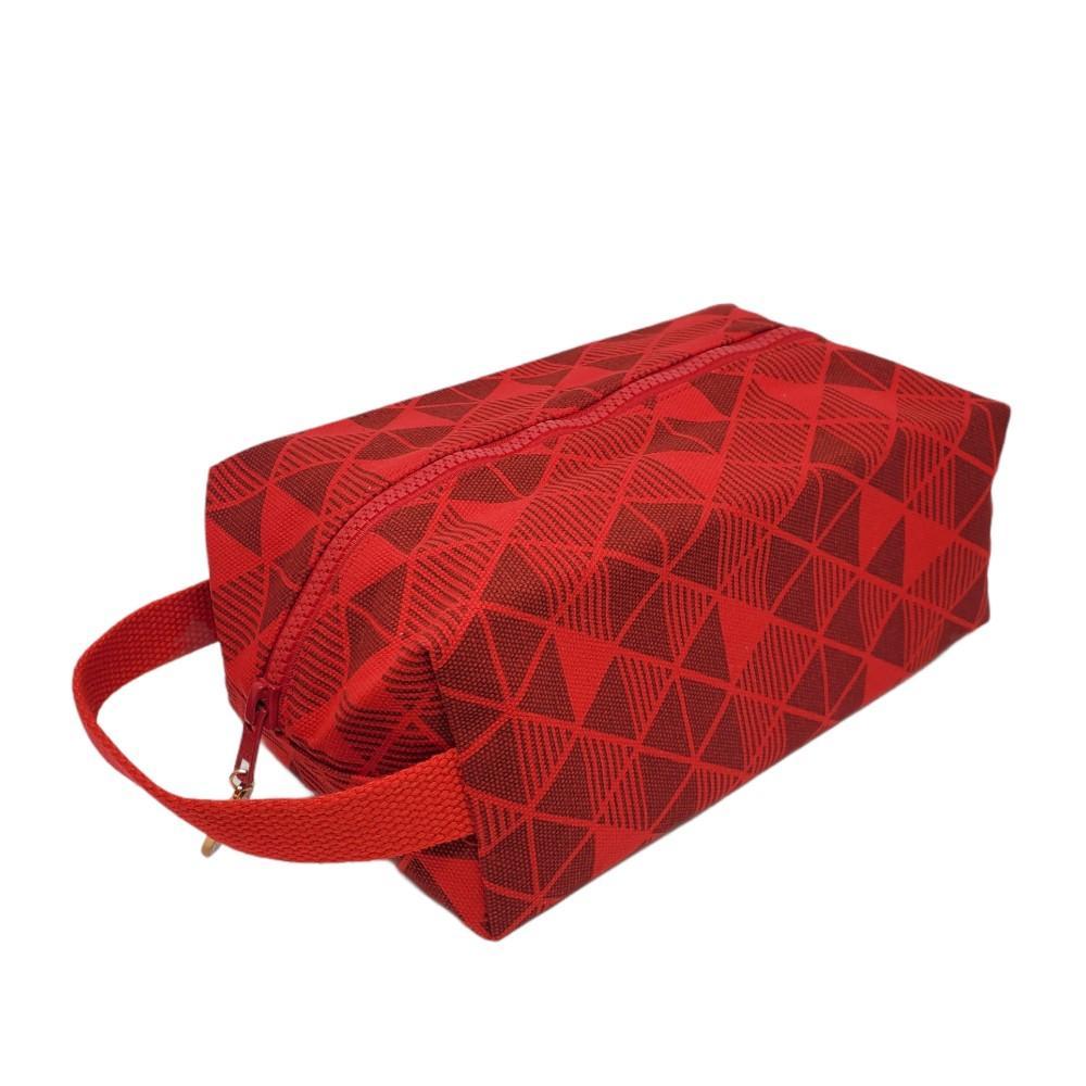 This toiletry bag is made with 100% cotton fabric printed with a red pyramid design on the exterior and has a brightly colored water-repellent 100% polyester fabric lining.