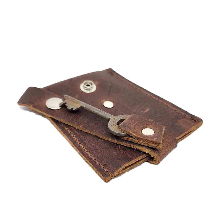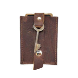 Hand-stitched reclaimed leather wallet in mahogany brown features an antique key affixed to a strap that is tucked inside to allow you to pop-up your cards for easy access. Close with the heavy-duty metal snap.