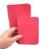 The books are stitched by hand using a contrasting colored waxed linen thread. Each journal features six sections of assorted paper and a pocket made from an envelope, perfect for storing paper ephemera and photos. The paper coordinates with the color of the cover and thread.
