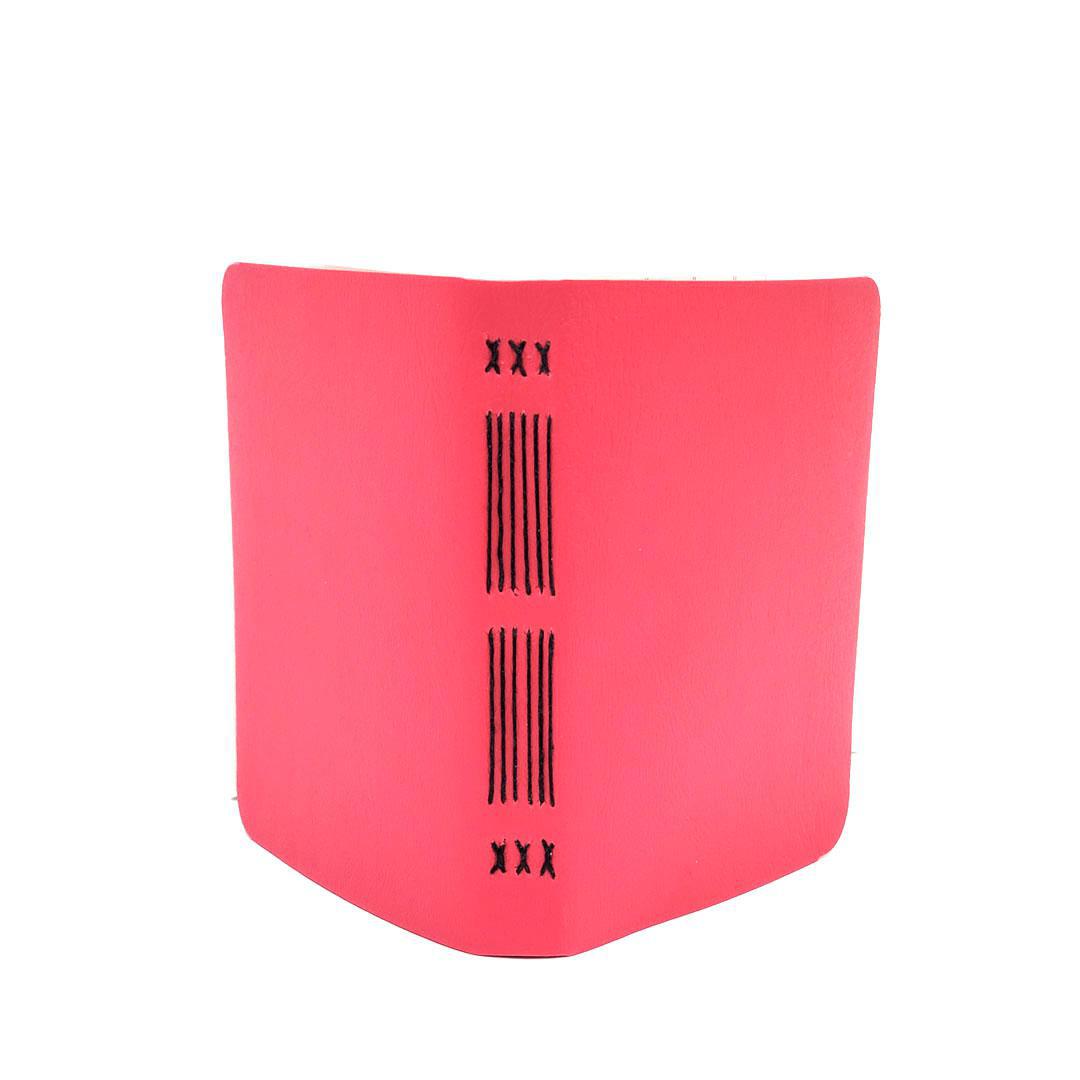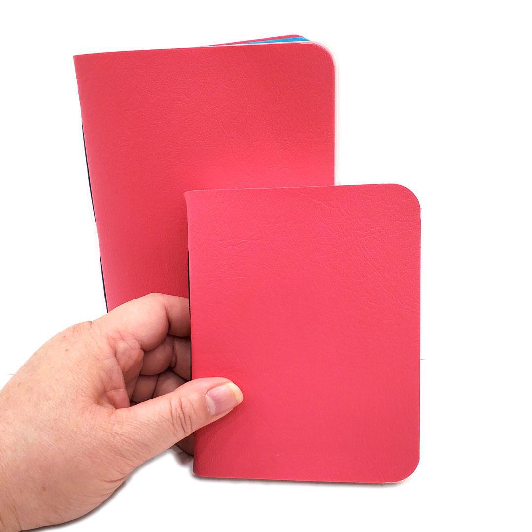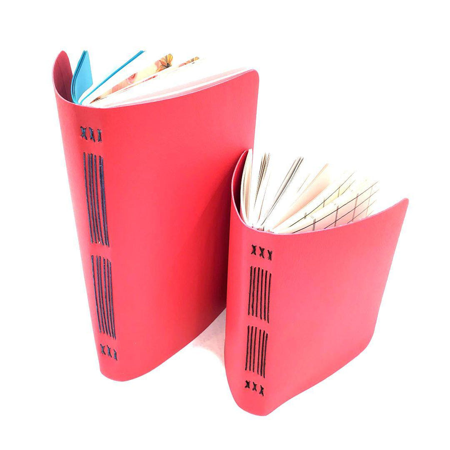 Available in two sizes, each one of these hand sewn mixed paper notebooks with a durable pink vegan leather cover is one-of-a-kind. The journals open flat and the rounded corners keep your pages protected.