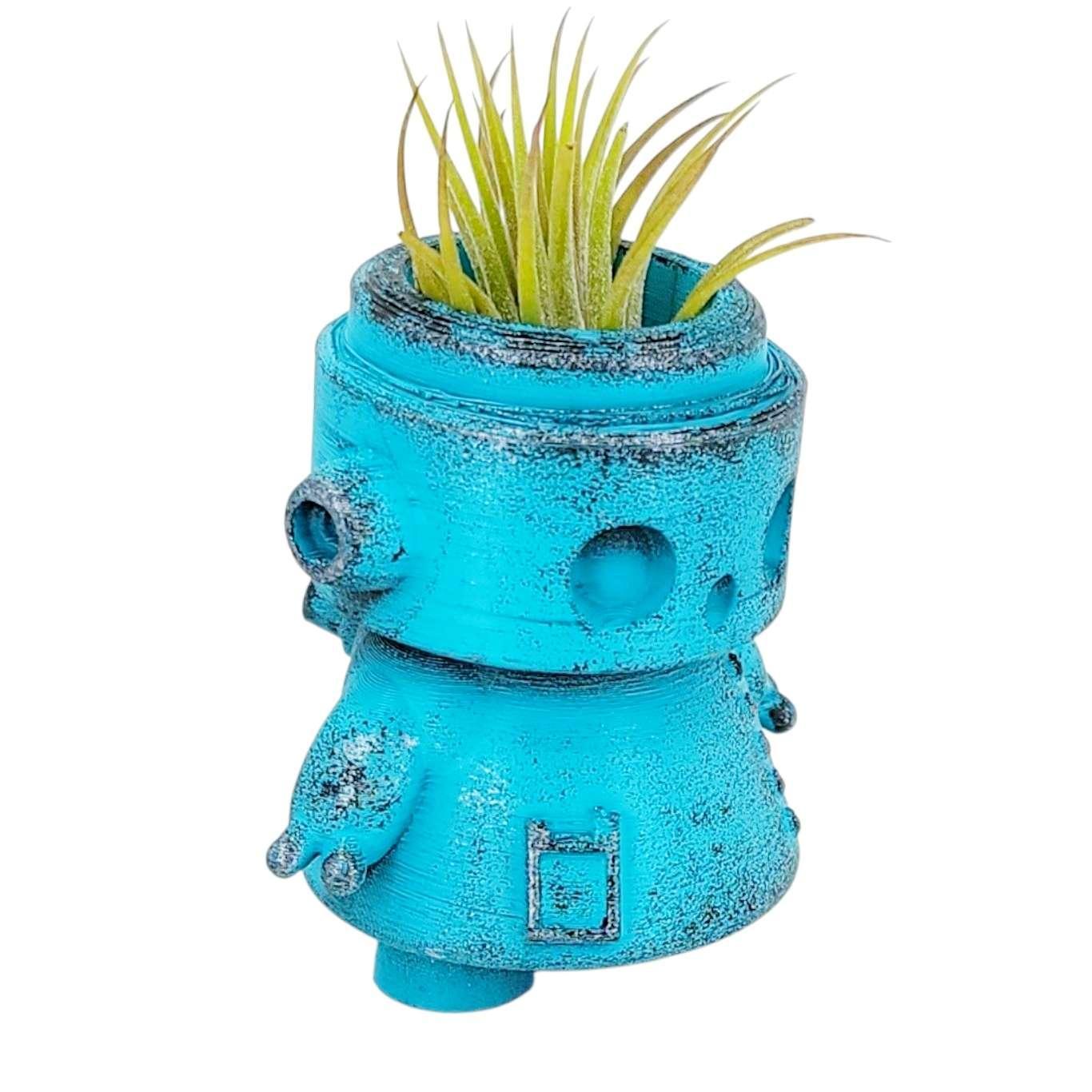 This friendly little planter features a weathered turquoise blue paint job, a line of rivets down the front of its body, and a surprised expression!