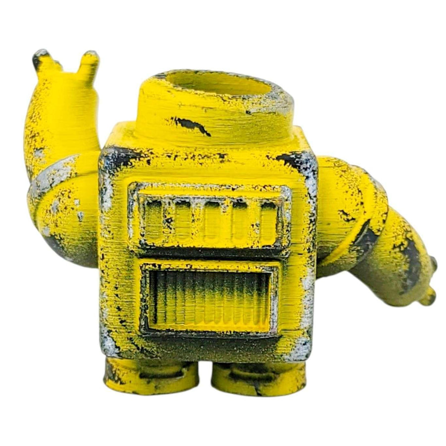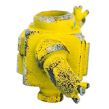 This friendly little planter features a weathered yellow paint job, a gauge readout and some buttons on the front of its body, and an open welcoming expression!