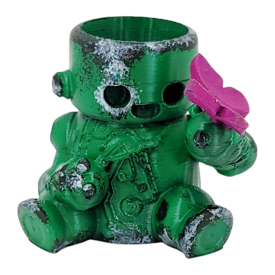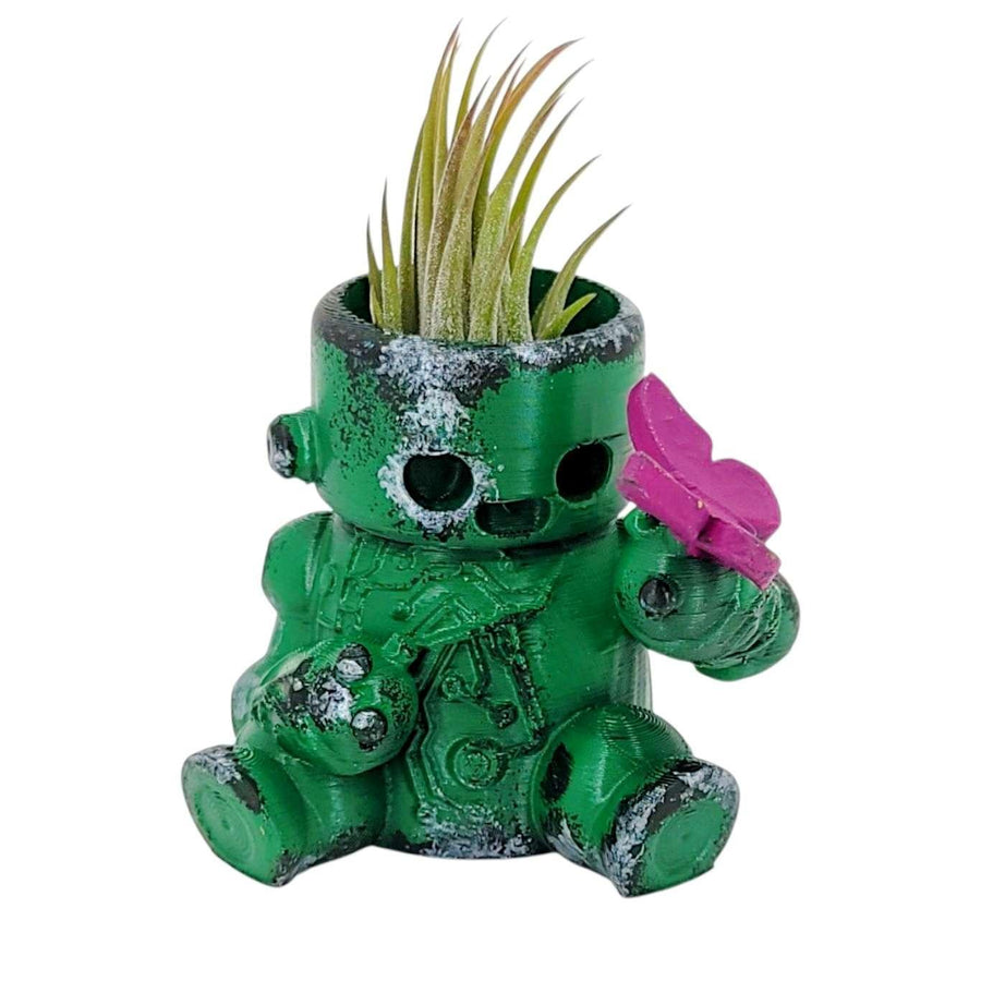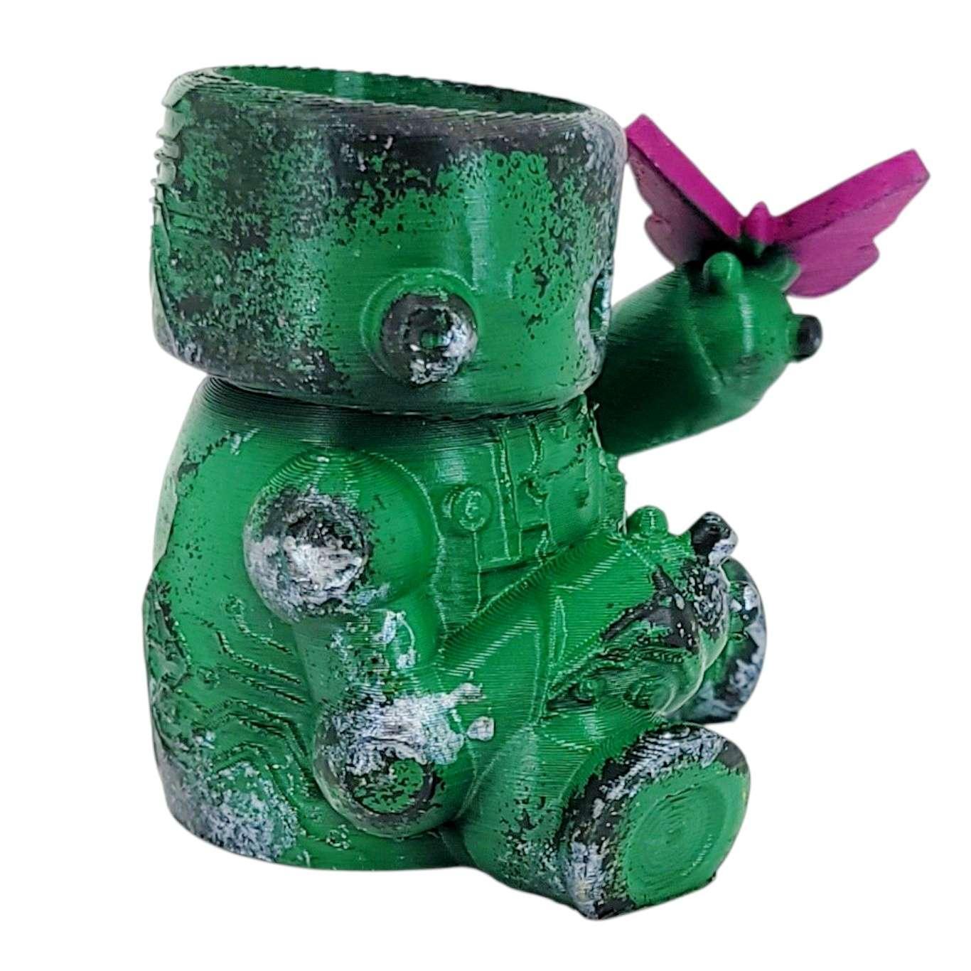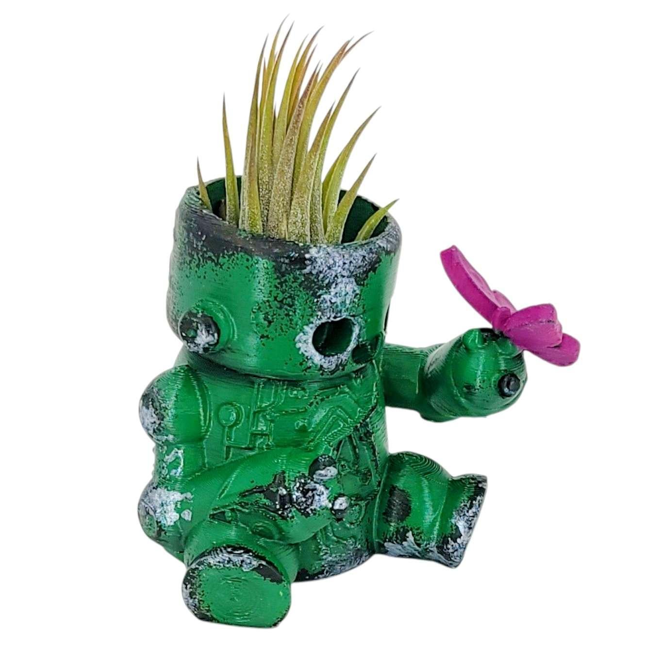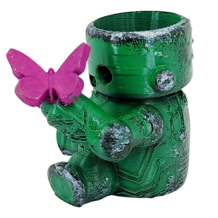 This friendly little planter features a weathered green paint job, circuitry on the front of its body, a butterfly friend, and a thoughtful expression!