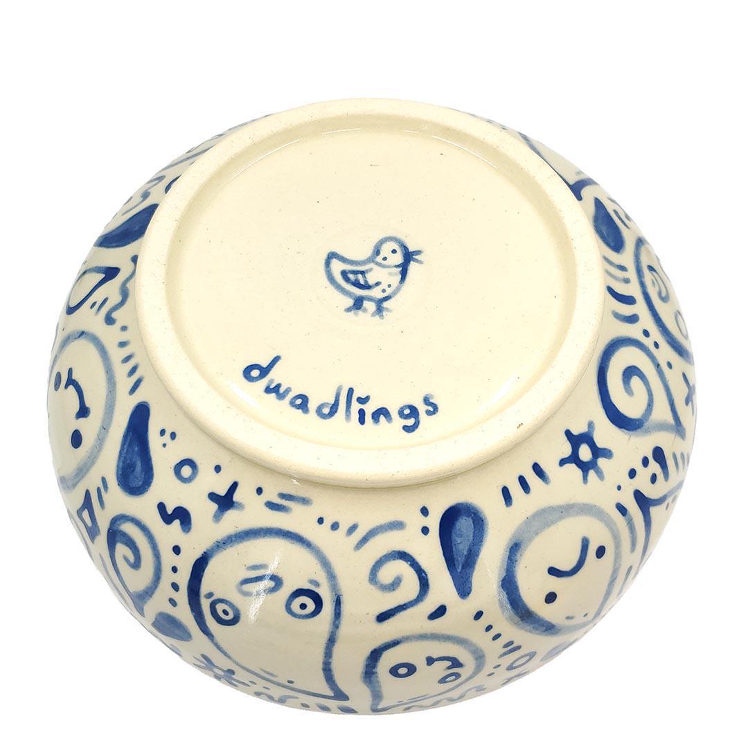 This hand painted ceramic bowl by Dwadlings features bold blue raindrop designs and expressive faces inside and out that make every angle interesting. Both functional and artful, it’s perfect for serving, display, or adding a touch of playful energy to your table.