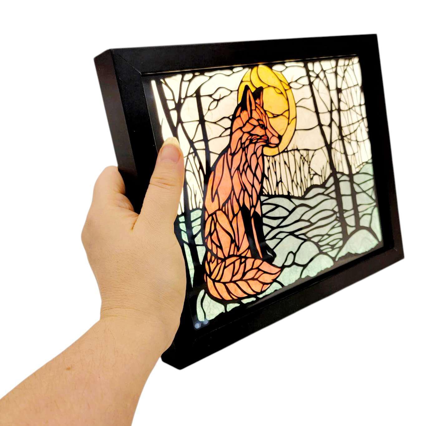 This multilayer hand-cut paper lightbox features a fox and has lights within that will make the box glow whenever you want. Perfectly sized to fit on a bookshelf or nook.
