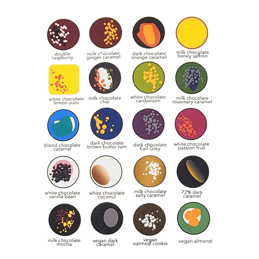 - Included flavors: Raspberry, ginger, orange, honey saffron, lemon yuzu, chai, cardamom, rosemary, blond, buttered rum, earl grey, passion fruit, vanilla bean, cherry, salty caramel, 72% dark