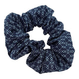 A true classic, this adorable cotton scrunchy featuring a black background with a grid-like pattern of overlapping right angle sections in white will keep your hair back in style!