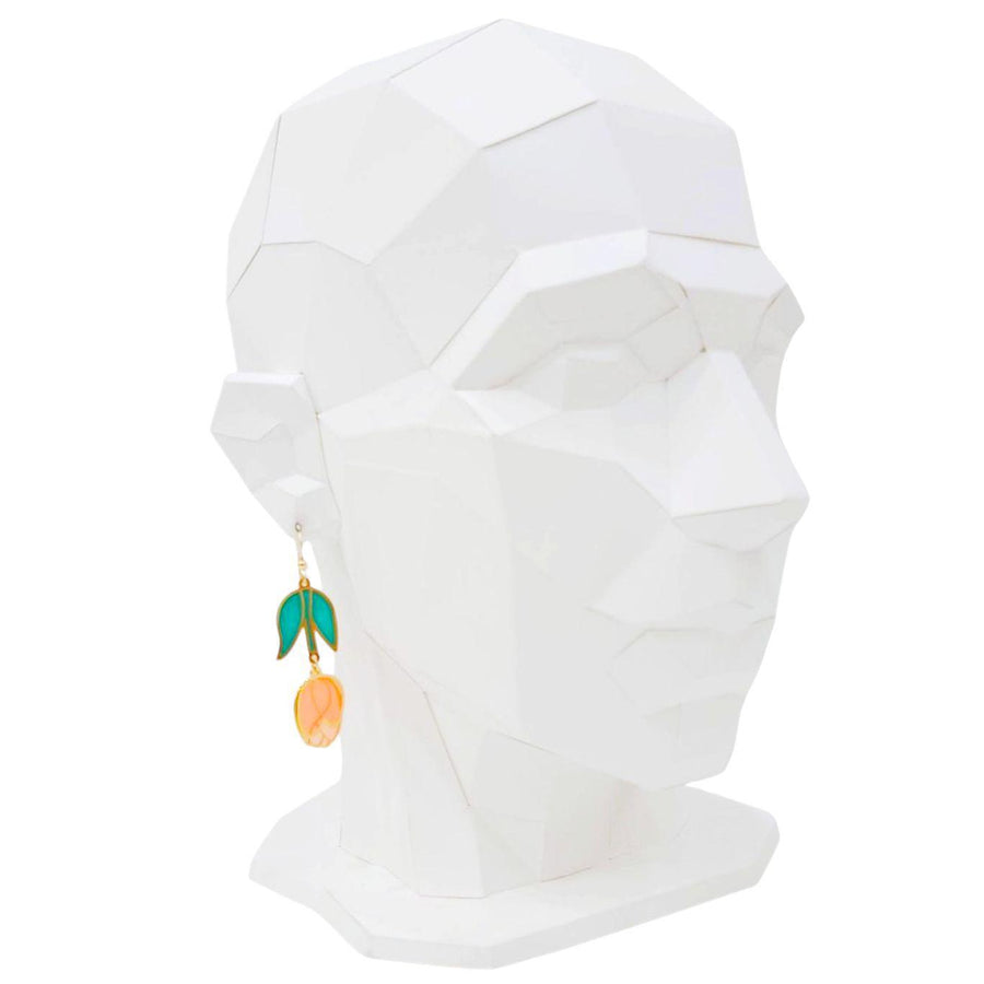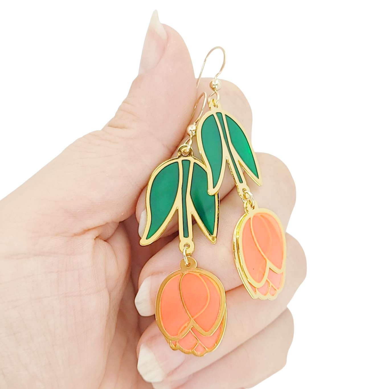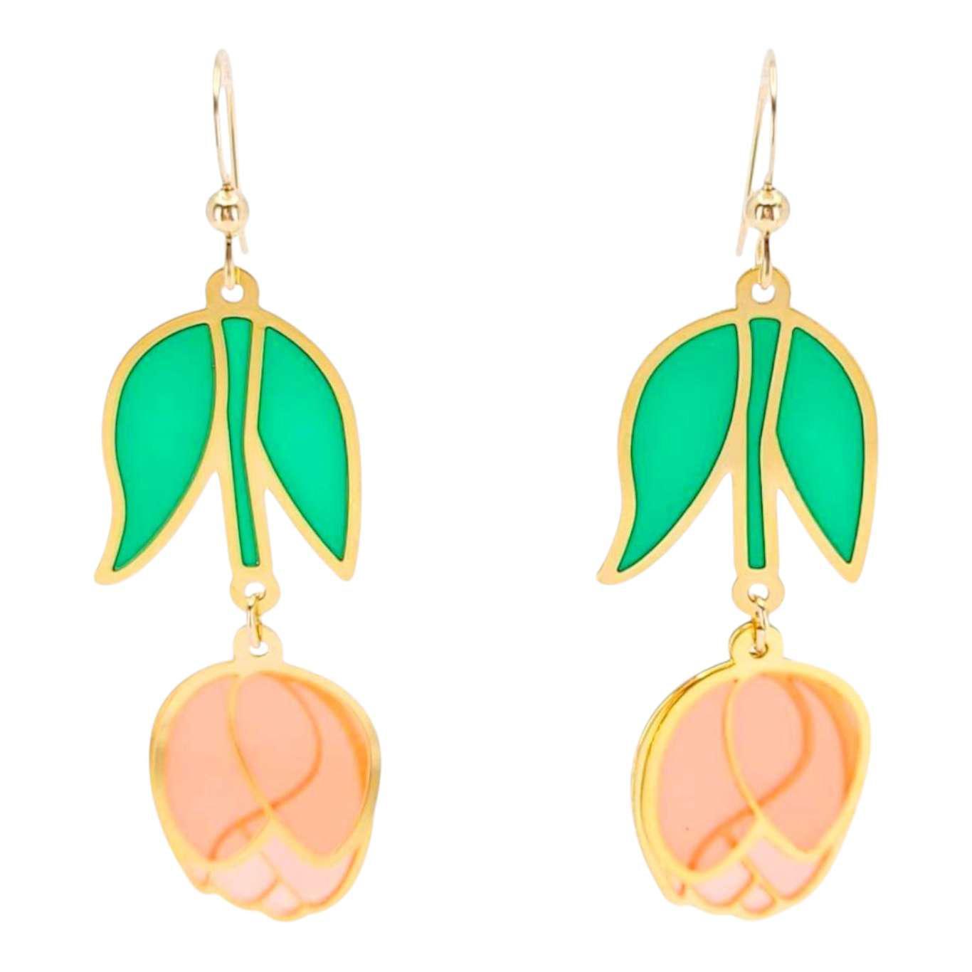 These beautiful tulip earrings will add a delicate pop of sweetness and whimsy to any outfit. The design features a vibrant tulip blossom in full bloom, with intricate detailing that captures the natural beauty of the flower. The petals are gently curved and on two separate panes, adding depth, dimension and extra movement to the design.