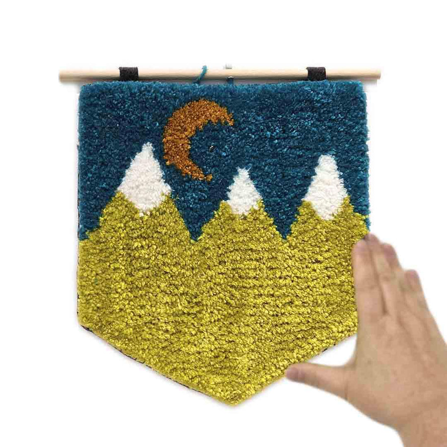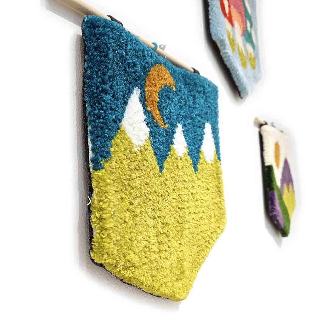 This tufted wall flag features a majestic green mountain scene on a background of deep teal and a bronze crescent moon above.