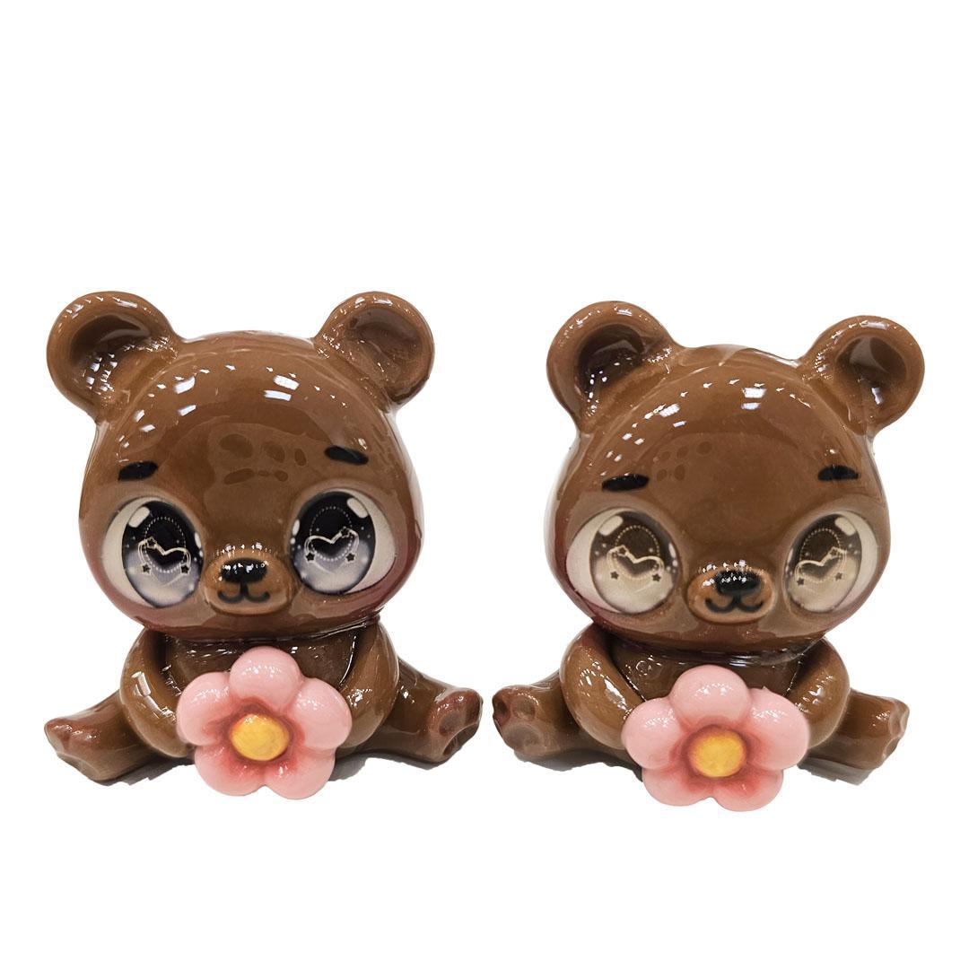 A sweet brown bear figurine holding a soft pink flower, finished with glossy details and expressive eyes. This charming handmade piece adds a gentle, cozy touch to shelves, desks, or gift collections.