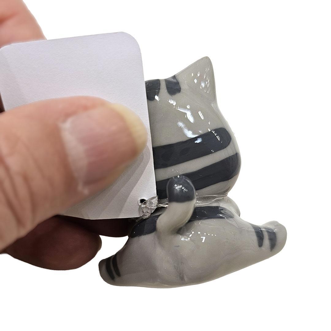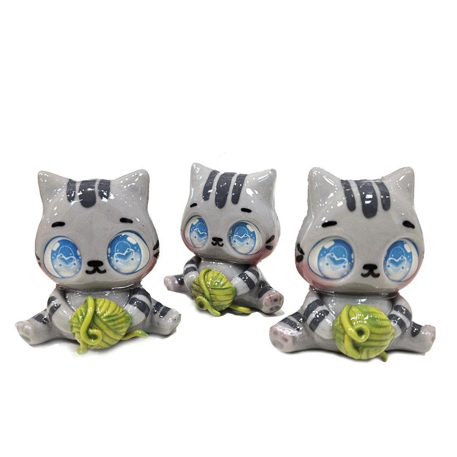 This sweet gray striped kitty figurine features wide, expressive eyes and a tiny bundle of green yarn held close. Handmade with charming details and finished with a glossy resin coat, this playful piece brings cozy, crafty energy to any shelf or desk.
