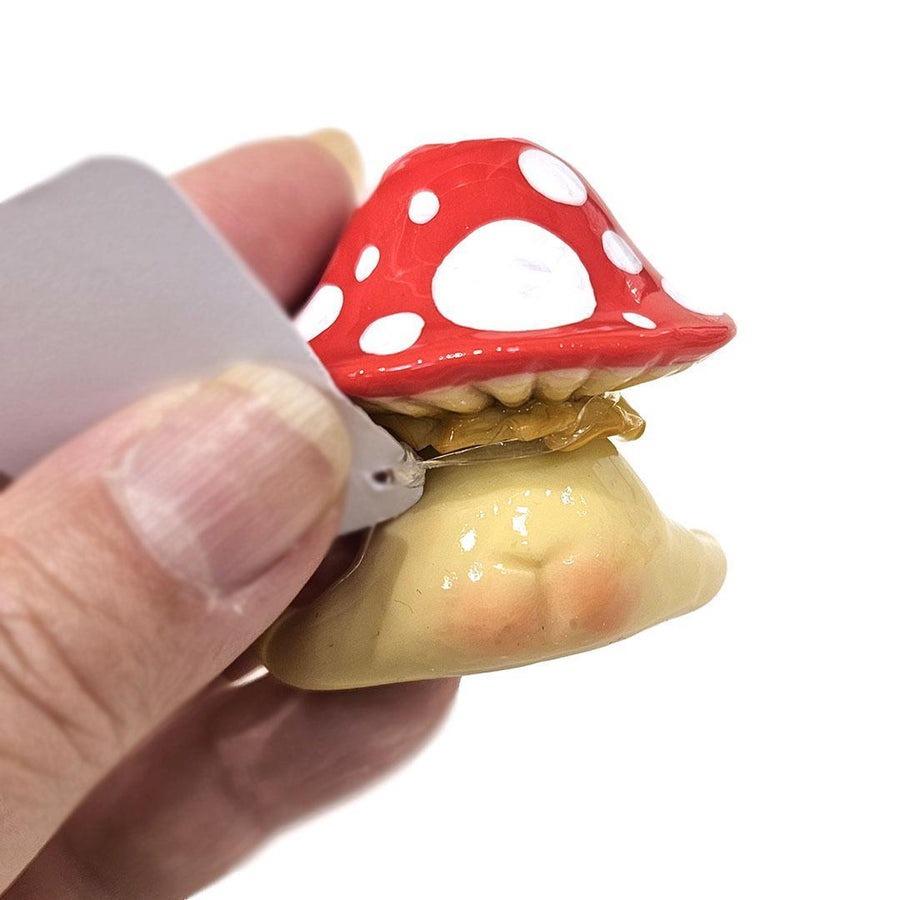 A sweet little woodland mushroom figurine with rosy cheeks, a bright red cap, and a tiny white flower detail. This cheerful character has a cozy, storybook feel and makes an adorable addition to shelves, desks, or curated collections.