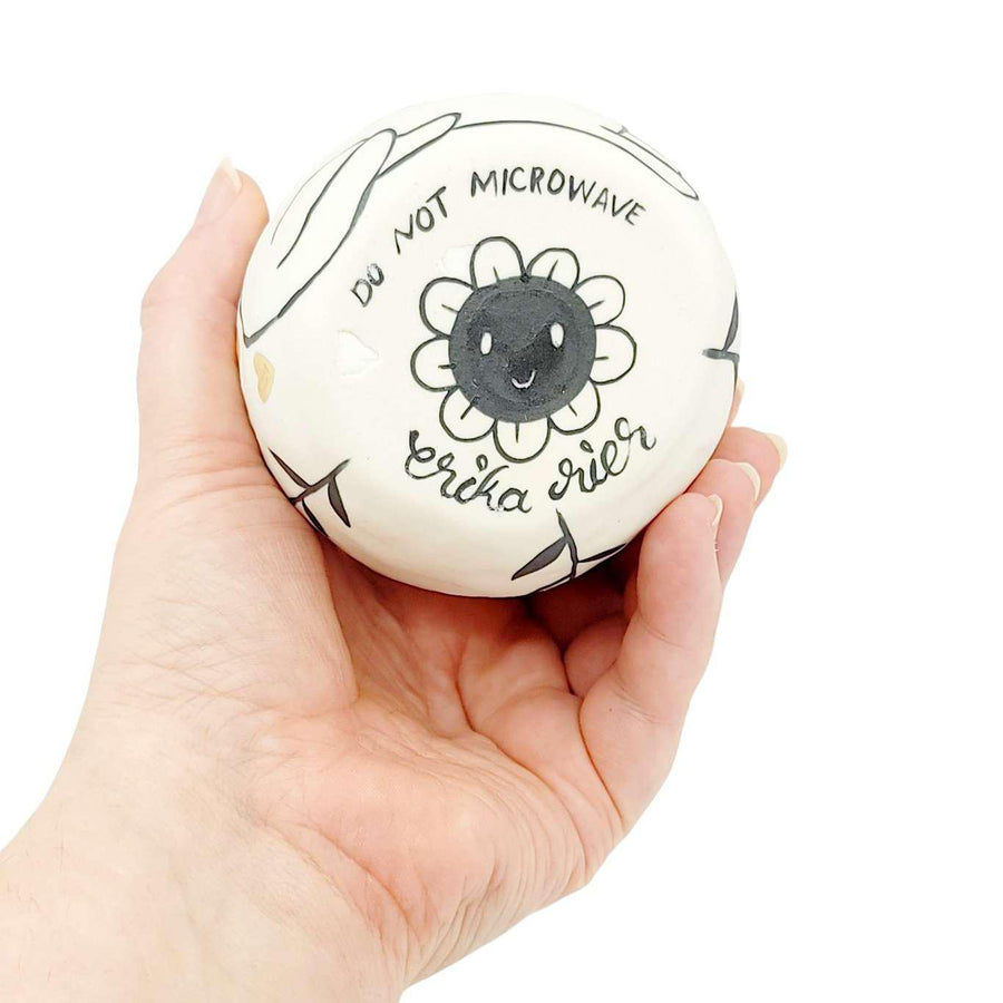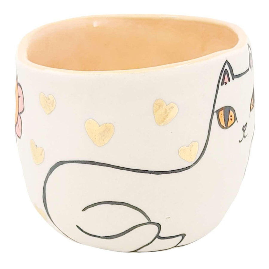 These cute tumblers feature white cats and bright flowers in the artist's signature folk surrealist style; they are made entirely by hand using a slip cast technique and then painted. Once fired, the cups are glazed on the interior. The outside is unglazed to highlight the smooth porcelain. Each cup is signed by hand on the bottom and little 22k gold luster hearts are painted around the cat before the tumbler is put through a third and final firing. The cups measure about 2.5” tall (they have an asymmetrical lip so one side is higher and the other a bit lower) and about 3.5” across. They hold just shy of 8 ounces of liquid. These mugs are food safe, dishwasher safe, but not microwave safe.
