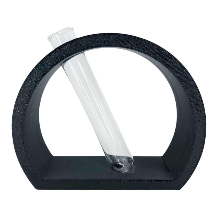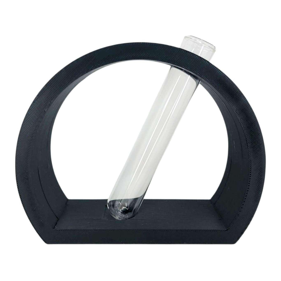 Nordic semi-circle vase or propagation station in black that holds one 25x150mm glass tube for a few stems or your favorite hydroponics plant cutting. This modern and minimalist stand will add a nice touch to any coffee table. Designed with slight slant but will not spill even when water is filled to the top; a perfectly etched groove holds the tube in place. Tubes are large enough to hold most plant cuttings. These make for an excellent housewarming gift!