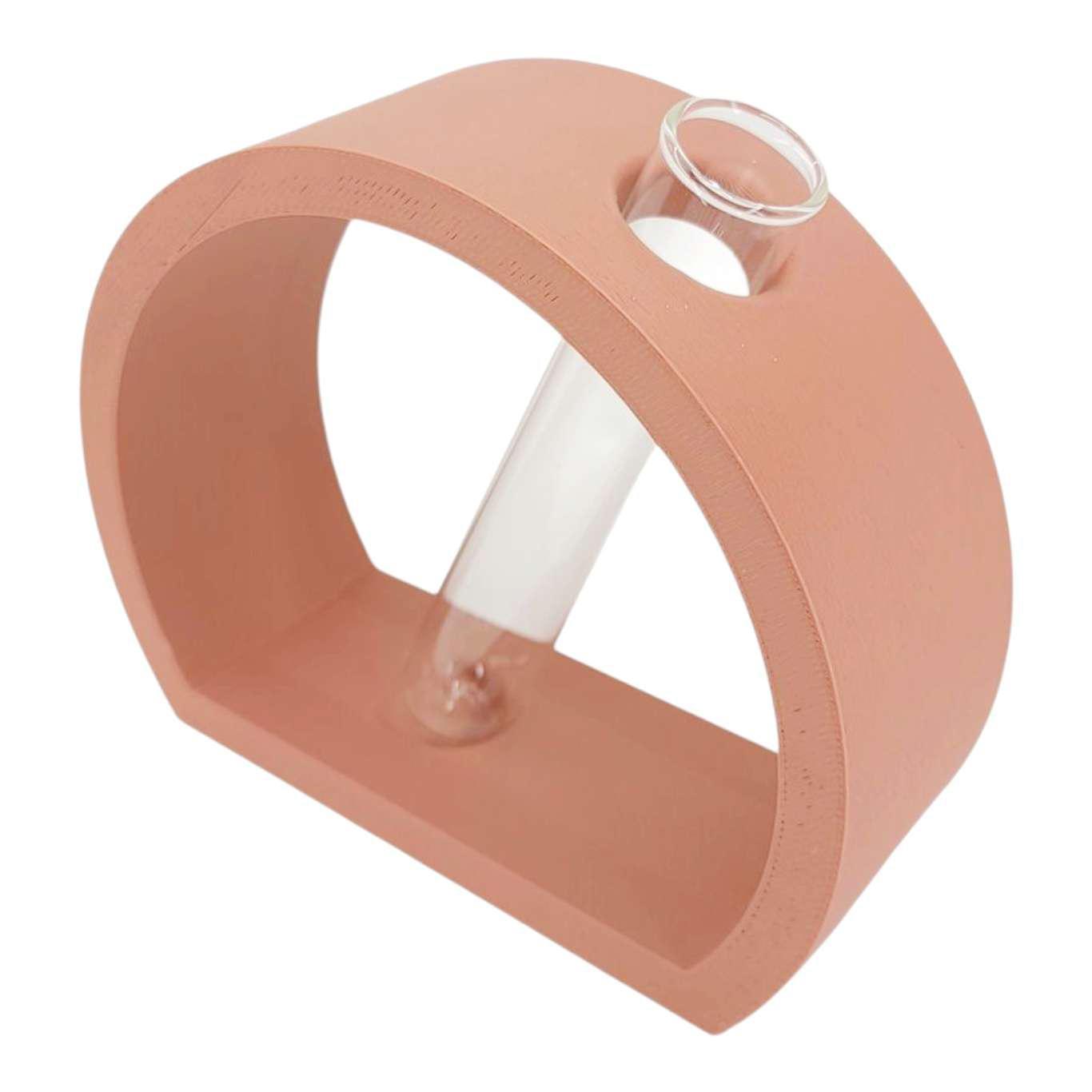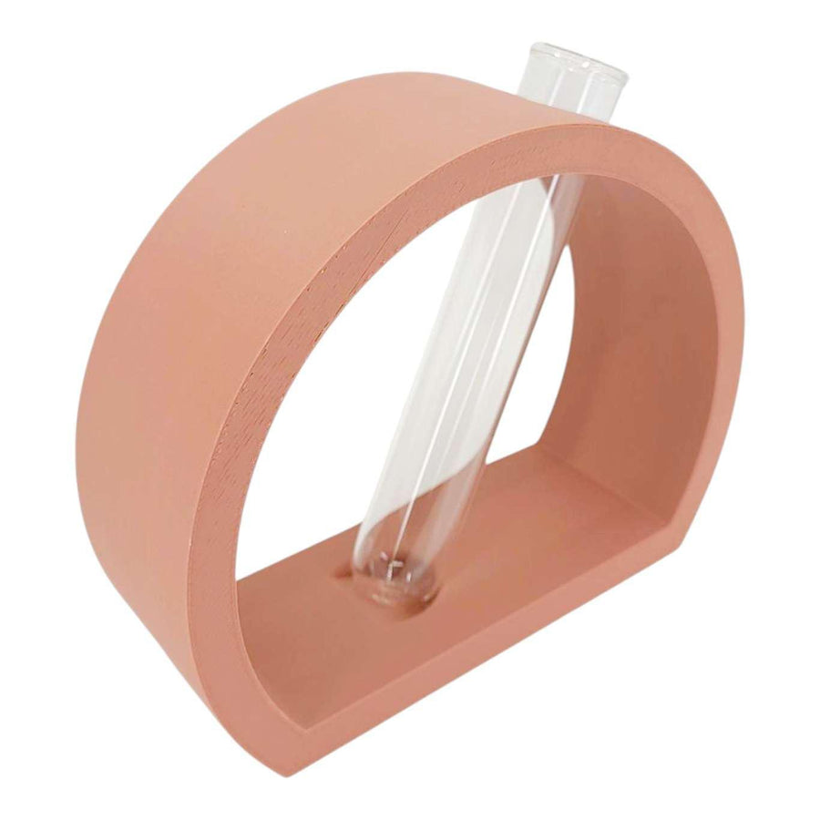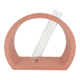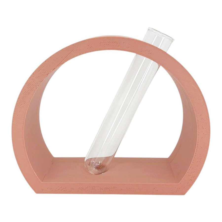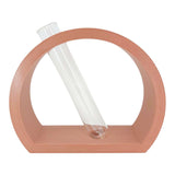 Nordic semi-circle vase or propagation station in earthy terracotta color that holds one 25x150mm glass tube for a few stems or your favorite hydroponics plant cutting. This modern and minimalist stand will add a nice touch to any coffee table. Designed with slight slant but will not spill even when water is filled to the top; a perfectly etched groove holds the tube in place. Tubes are large enough to hold most plant cuttings. These make for an excellent housewarming gift!