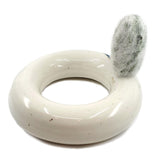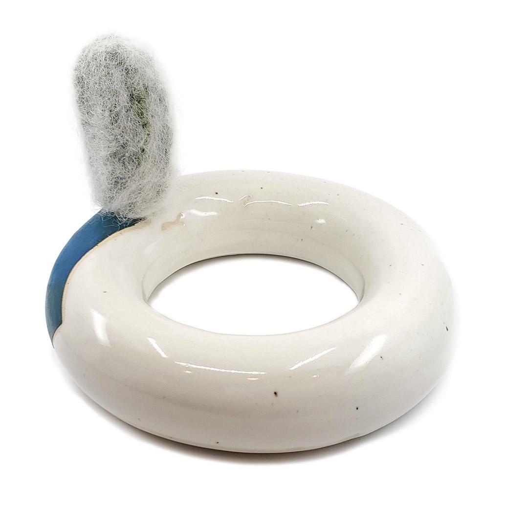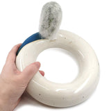 - Ceramic pot is donut-shaped with cream-colored glaze and a deep teal blue accent