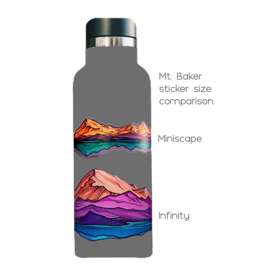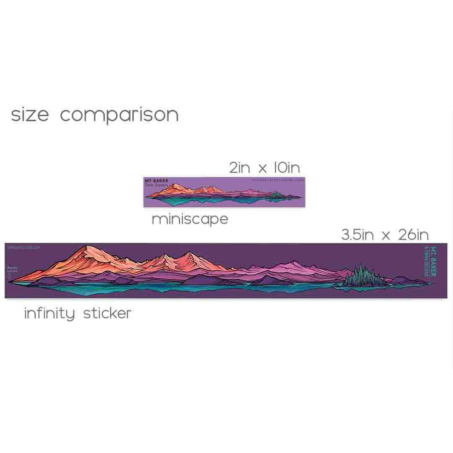 A smaller size compared to the Infinity Stickers, this Miniscape sticker illustrates the moment Alpenglow illuminates Mt. Baker and the Twin Sisters mountains.