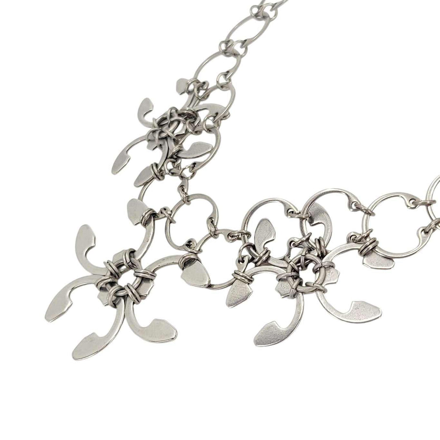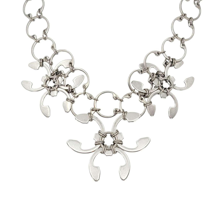 This lovely necklace featuring trios of C-shaped rings linked by jump rings has a secret - it’s made of engineering hardware used in cars, airplanes, motorcycles, boats, and tech!